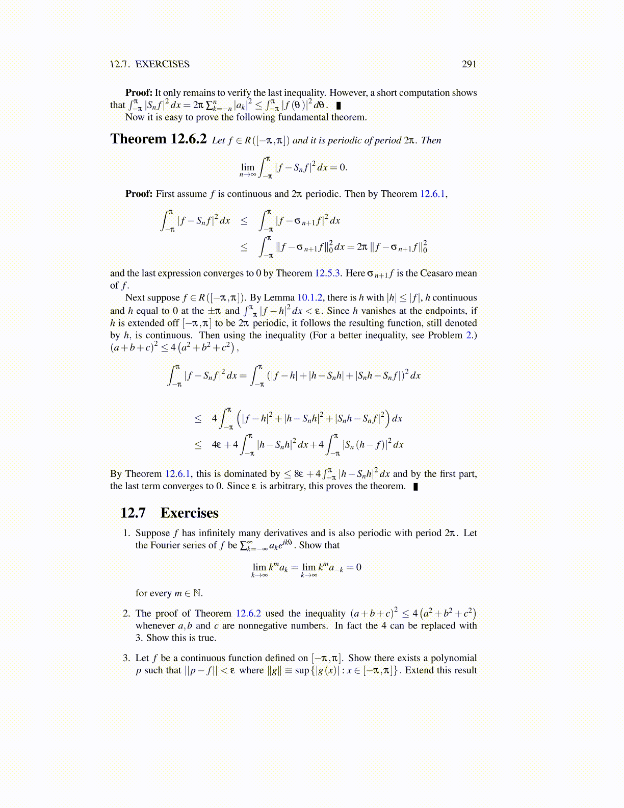 ∣∣a′k∣∣2 < ∞ and then show this implies ∑ |ak| < ∞. You might want to usethe Cauchy Schwarz inequality in Theorem 2.15.1 to do this part. Then using theversion of the Weierstrass M test given in Problem 10 obtain uniform convergenceof the Fourier series to f .