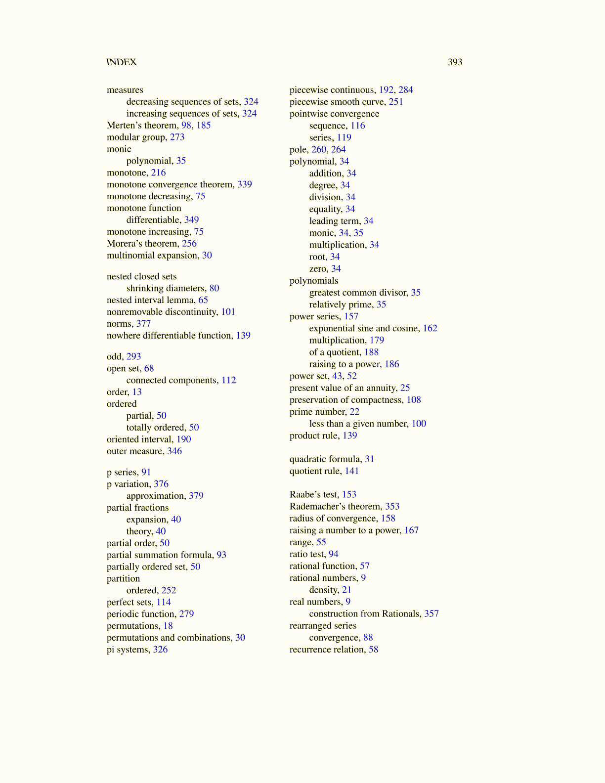 estimate, 120Weierstrass approximation theorem, 121Weierstrass Bolzano theorem, 184Weierstrass M test, 119, 292well ordered, 19winding number, 277