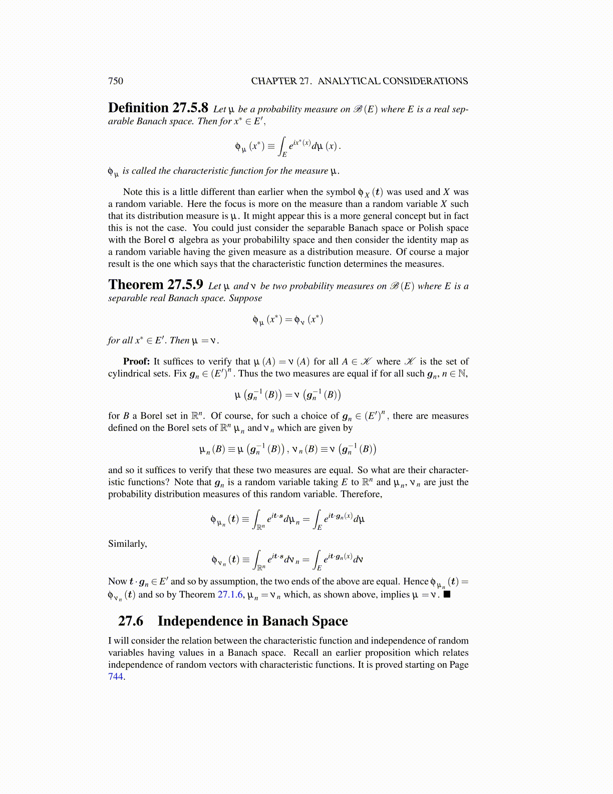 27.6 Independence in Banach SpaceI will consider the relation between the characteristic function and independence of randomvariables having values in a Banach space. Recall an earlier proposition which relatesindependence of random vectors with characteristic functions. It is proved starting on Page744.