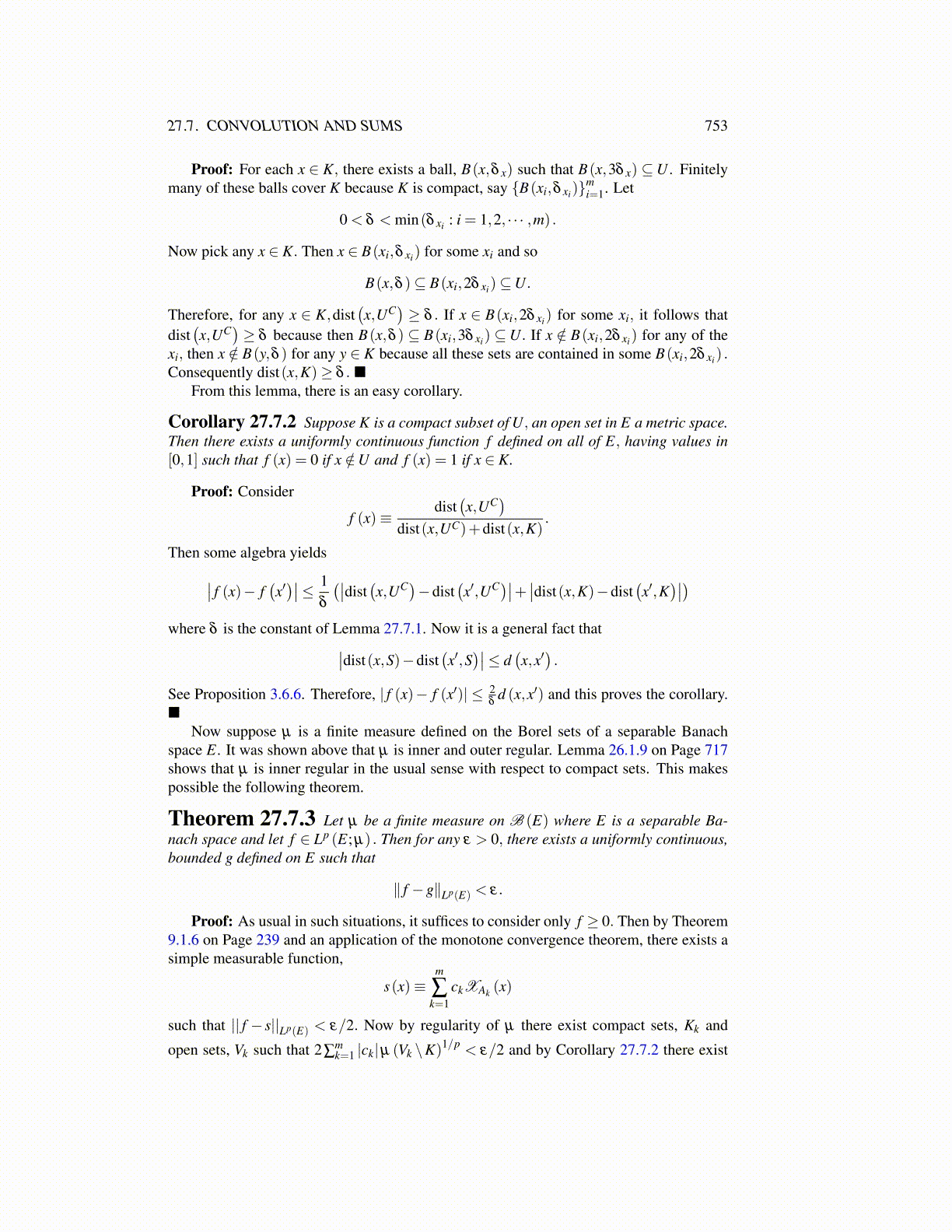 Theorem 27.7.3 Let µ be a finite measure on B (E) where E is a separable Ba-nach space and let f ∈ Lp (E; µ) . Then for any ε > 0, there exists a uniformly continuous,bounded g defined on E such that
