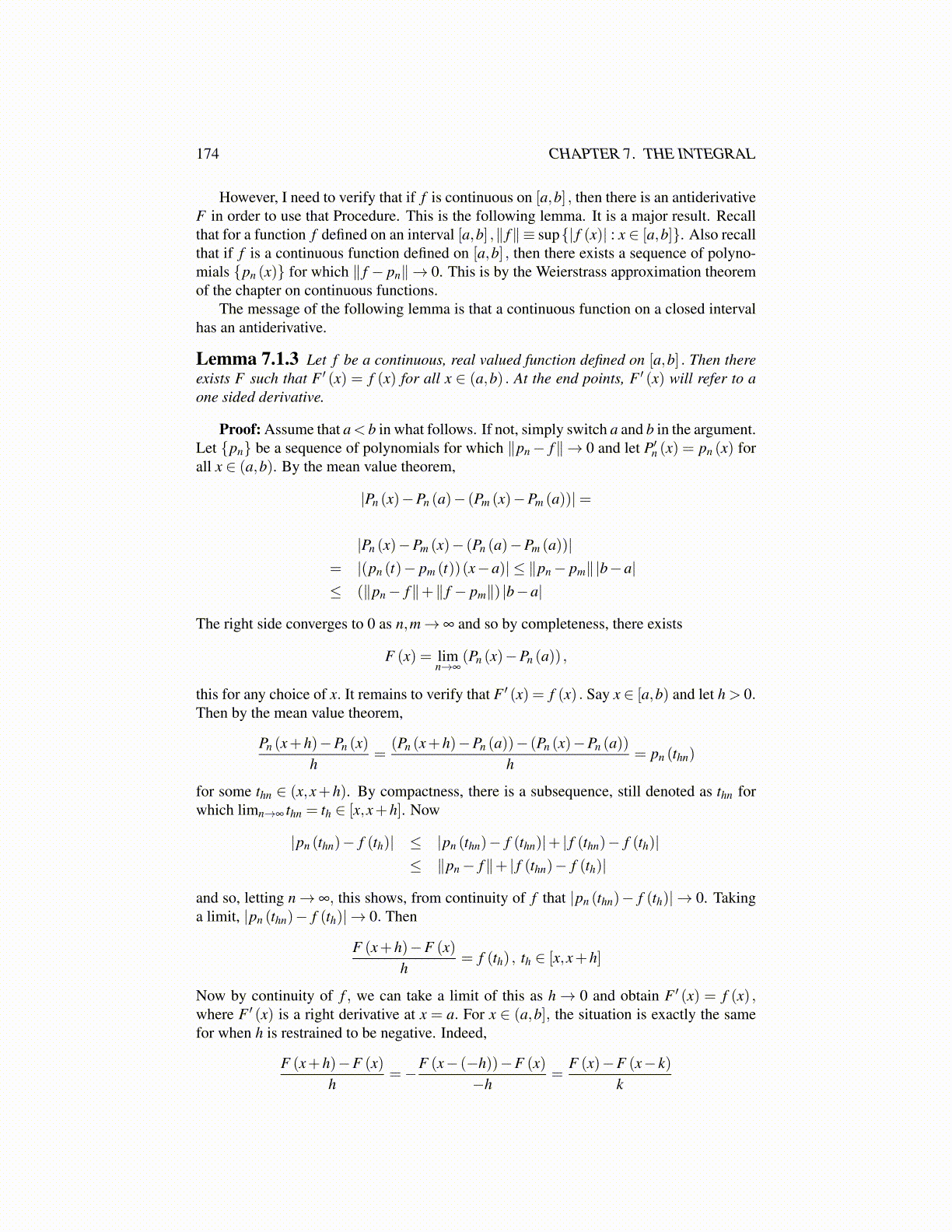 Lemma 7.1.3 Let f be a continuous, real valued function defined on [a,b] . Then thereexists F such that F ′ (x) = f (x) for all x ∈ (a,b) . At the end points, F ′ (x) will refer to aone sided derivative.