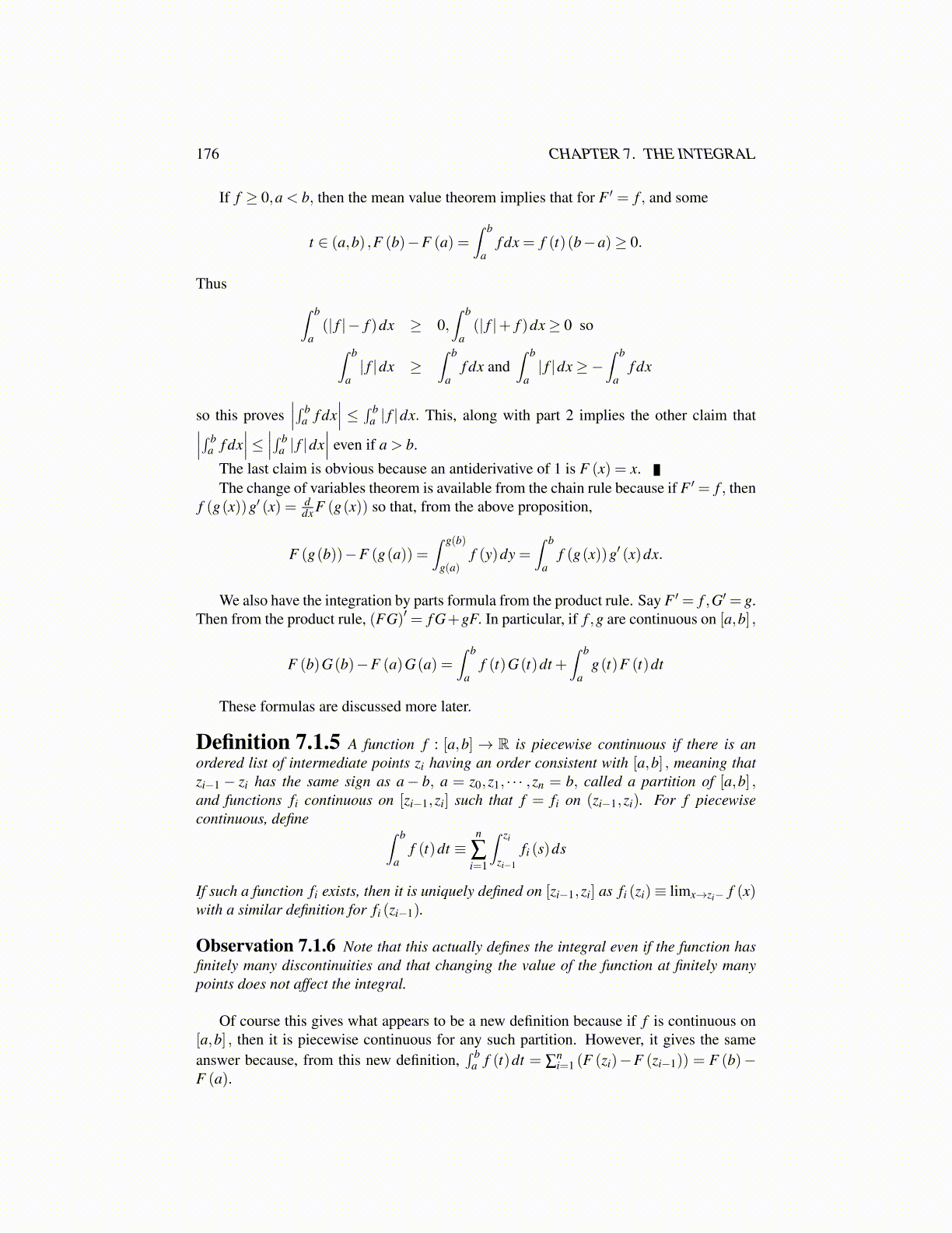 Observation 7.1.6 Note that this actually defines the integral even if the function hasfinitely many discontinuities and that changing the value of the function at finitely manypoints does not affect the integral.