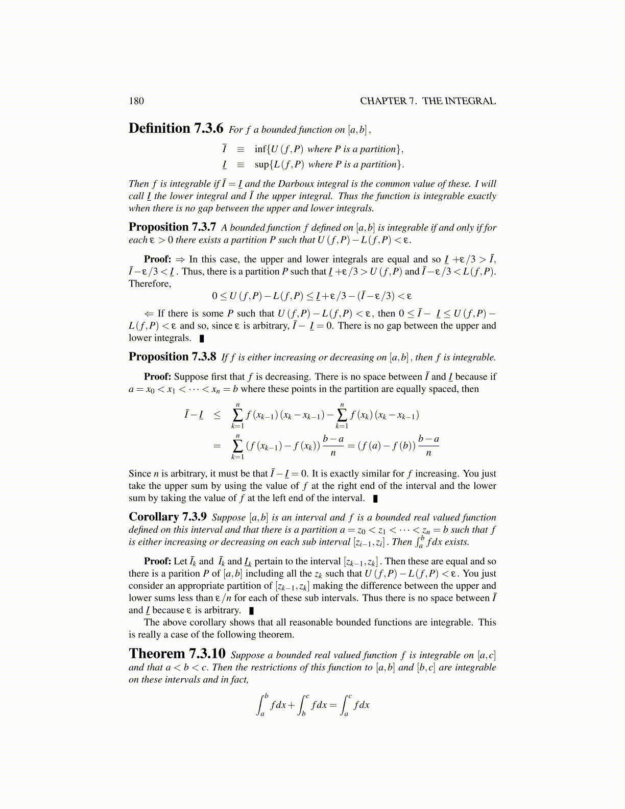 Proposition 7.3.7 A bounded function f defined on [a,b] is integrable if and only if foreach ε > 0 there exists a partition P such that U ( f ,P)−L( f ,P)< ε .