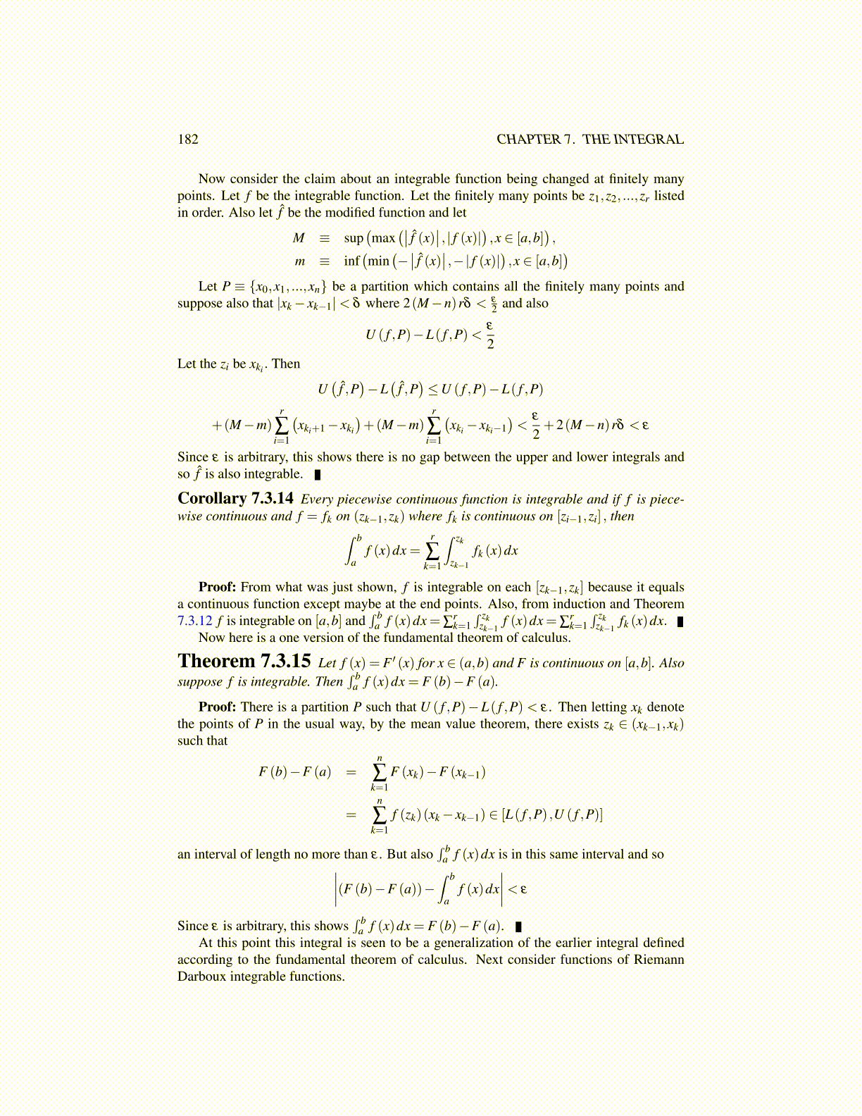 Proof: From what was just shown, f is integrable on each [zk−1,zk] because it equalsa continuous function except maybe at the end points. Also, from induction and Theorem7.3.12 f is integrable on [a,b] and