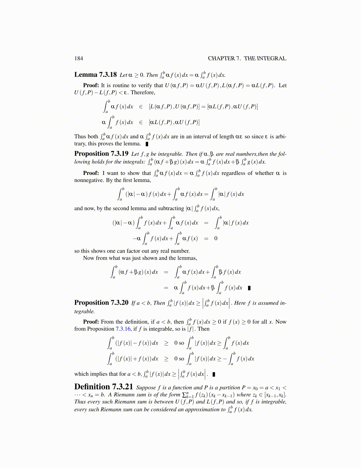 Proposition 7.3.19 Let f ,g be integrable. Then if α,β are real numbers,then the fol-lowing holds for the integrals: