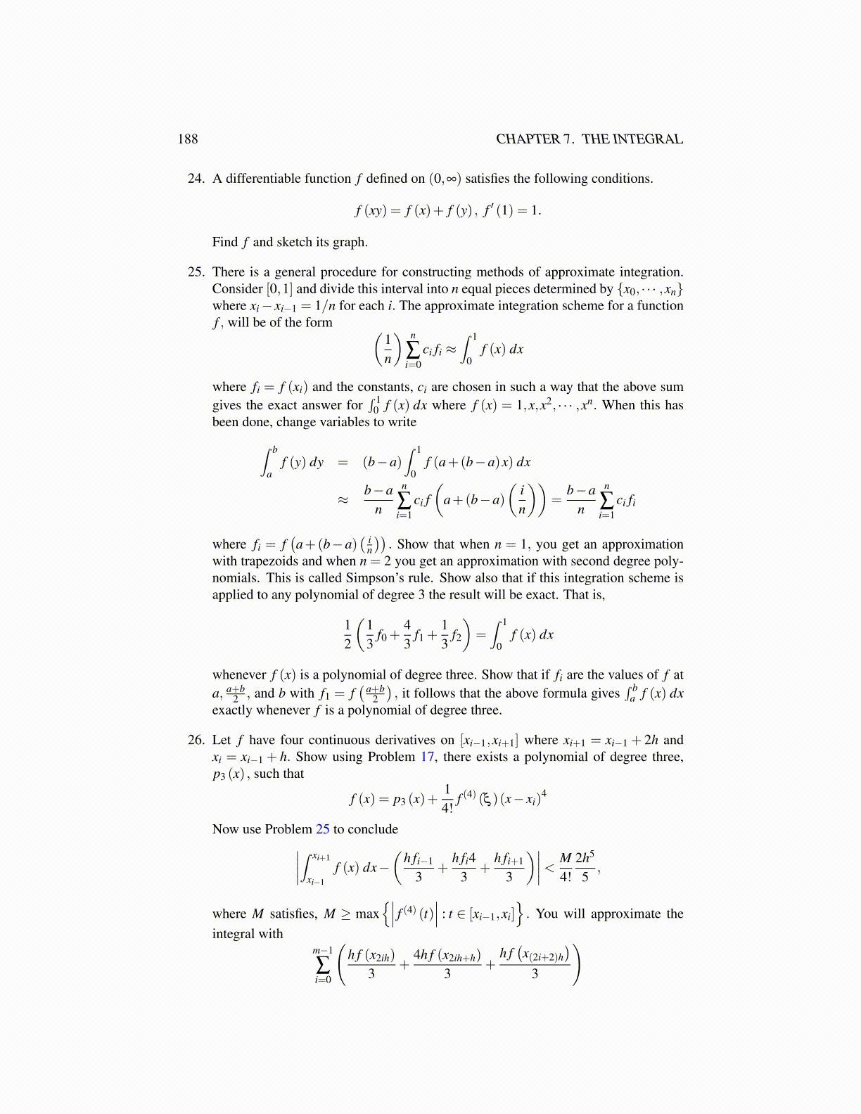 25. There is a general procedure for constructing methods of approximate integration.Consider [0,1] and divide this interval into n equal pieces determined by {x0, · · · ,xn}where xi − xi−1 = 1/n for each i. The approximate integration scheme for a functionf , will be of the form (