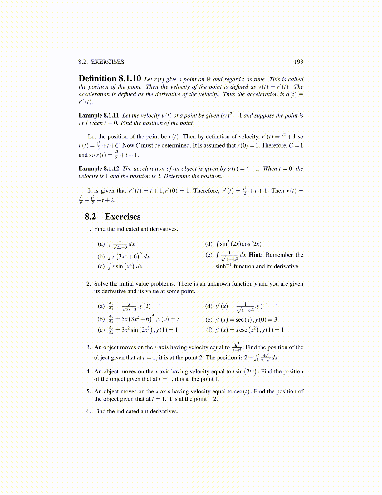 Example 8.1.11 Let the velocity v(t) of a point be given by t2 +1 and suppose the point isat 1 when t = 0. Find the position of the point.