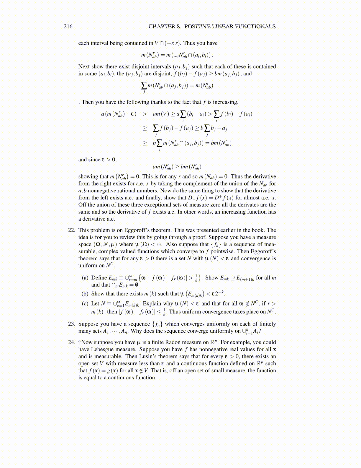 22. This problem is on Eggoroff’s theorem. This was presented earlier in the book. Theidea is for you to review this by going through a proof. Suppose you have a measurespace (Ω,F ,µ) where µ (Ω) < ∞. Also suppose that { fk} is a sequence of mea-surable, complex valued functions which converge to f pointwise. Then Eggoroff’stheorem says that for any ε > 0 there is a set N with µ (N) < ε and convergence isuniform on NC.