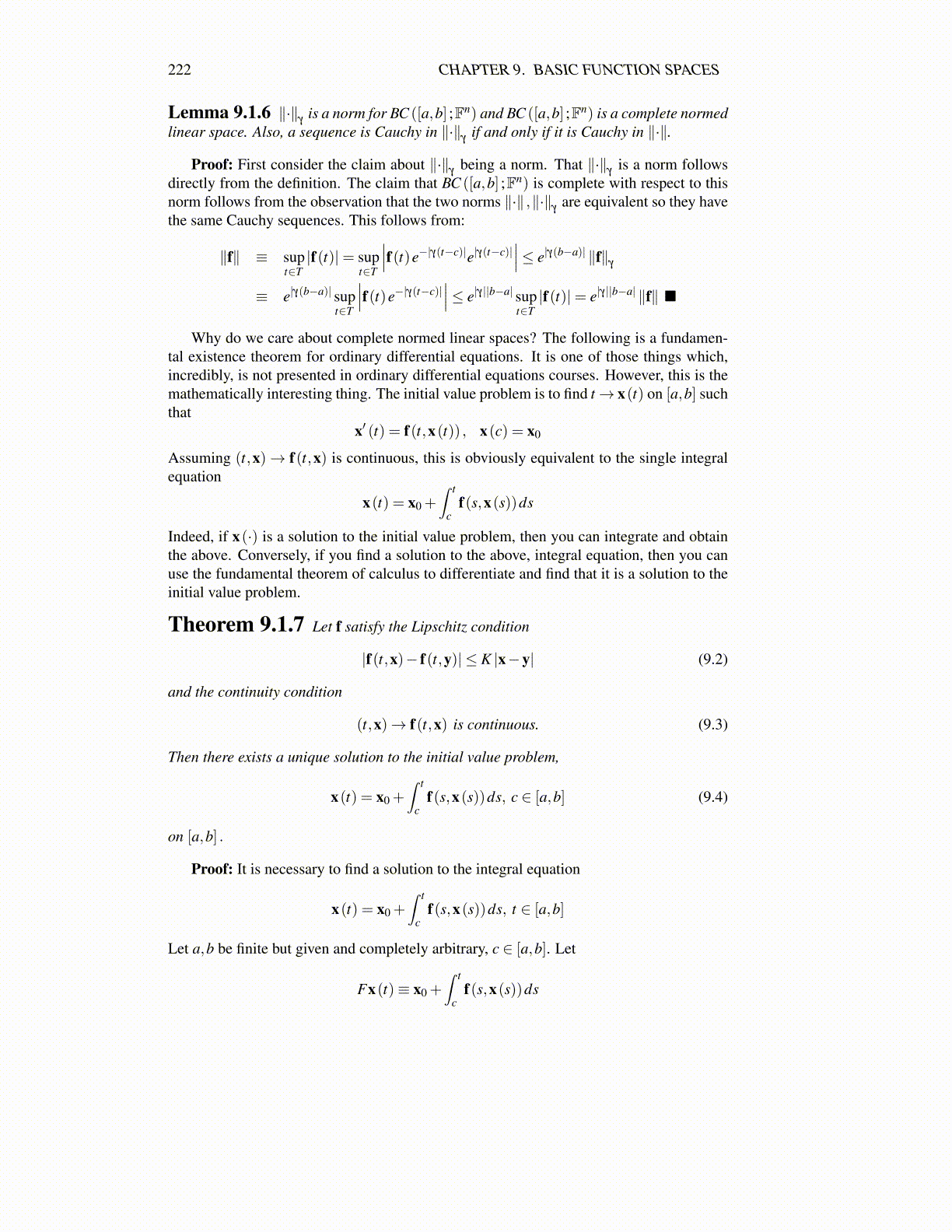 Why do we care about complete normed linear spaces? The following is a fundamen-tal existence theorem for ordinary differential equations. It is one of those things which,incredibly, is not presented in ordinary differential equations courses. However, this is themathematically interesting thing. The initial value problem is to find t→ x(t) on [a,b] suchthat