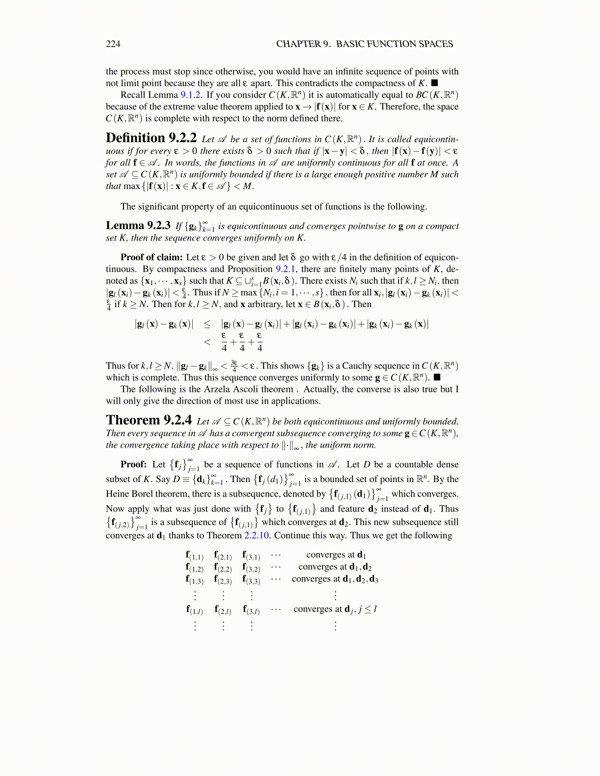 Theorem 9.2.4 Let A ⊆C (K,Rn) be both equicontinuous and uniformly bounded.Then every sequence in A has a convergent subsequence converging to some g∈C (K,Rn),the convergence taking place with respect to ∥·∥