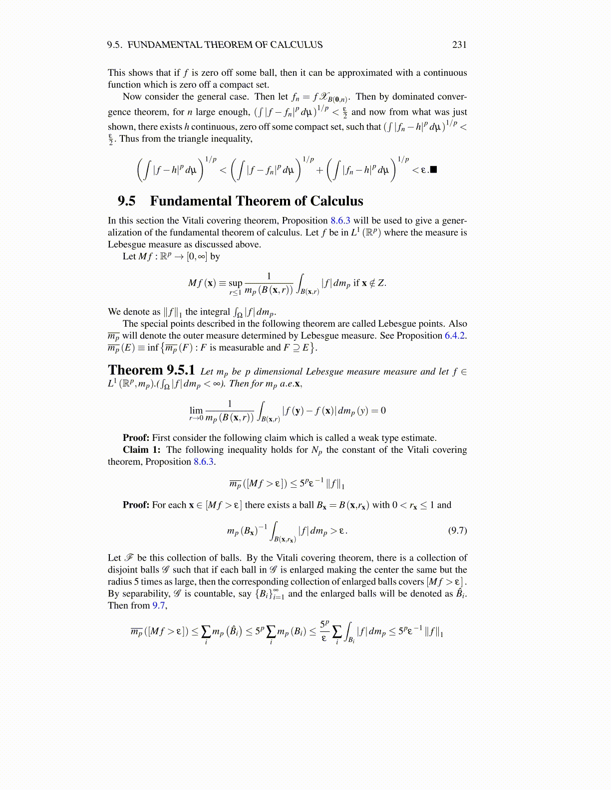 9.5 Fundamental Theorem of CalculusIn this section the Vitali covering theorem, Proposition 8.6.3 will be used to give a gener-alization of the fundamental theorem of calculus. Let f be in L1 (Rp) where the measure isLebesgue measure as discussed above.