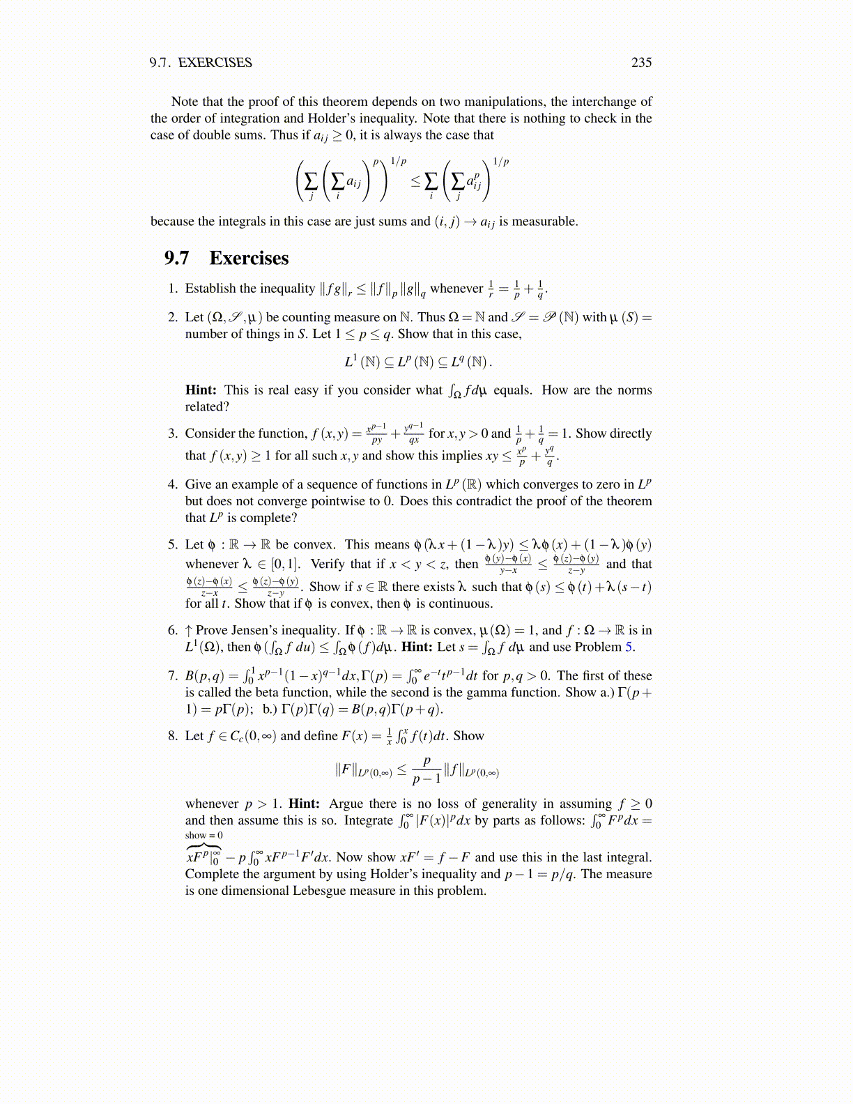 Note that the proof of this theorem depends on two manipulations, the interchange ofthe order of integration and Holder’s inequality. Note that there is nothing to check in thecase of double sums. Thus if ai j ≥ 0, it is always the case that(