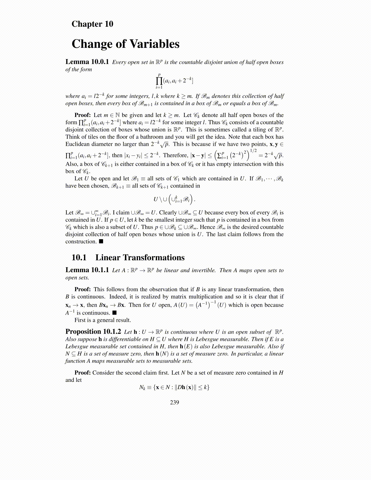 Change of VariablesLemma 10.0.1 Every open set in Rp is the countable disjoint union of half open boxesof the form