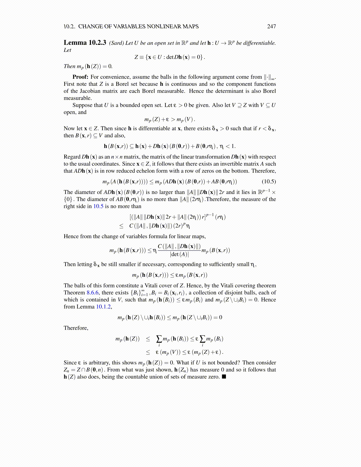 Since ε is arbitrary, this shows mp (h(Z)) = 0. What if U is not bounded? Then considerZn = Z ∩B(0,n) . From what was just shown, h(Zn) has measure 0 and so it follows thath(Z) also does, being the countable union of sets of measure zero. ■