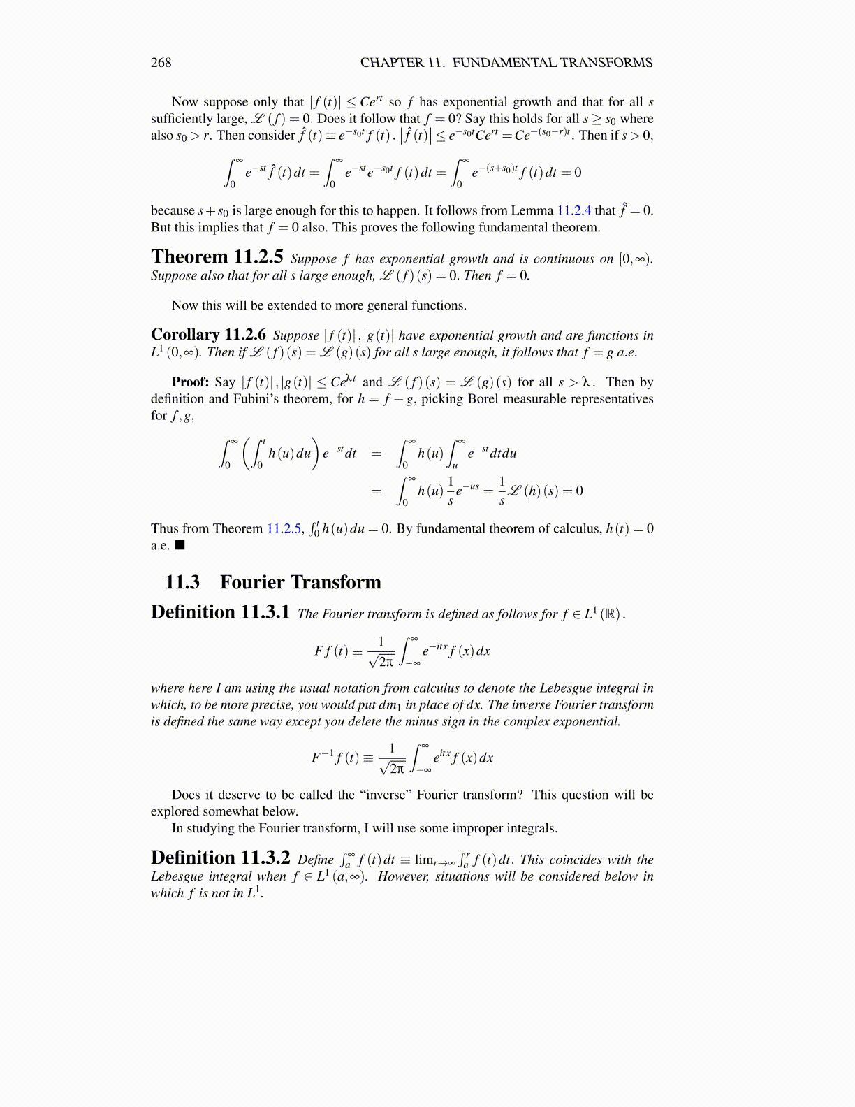 Corollary 11.2.6 Suppose | f (t)| , |g(t)| have exponential growth and are functions inL1 (0,∞). Then if L ( f )(s) = L (g)(s) for all s large enough, it follows that f = g a.e.