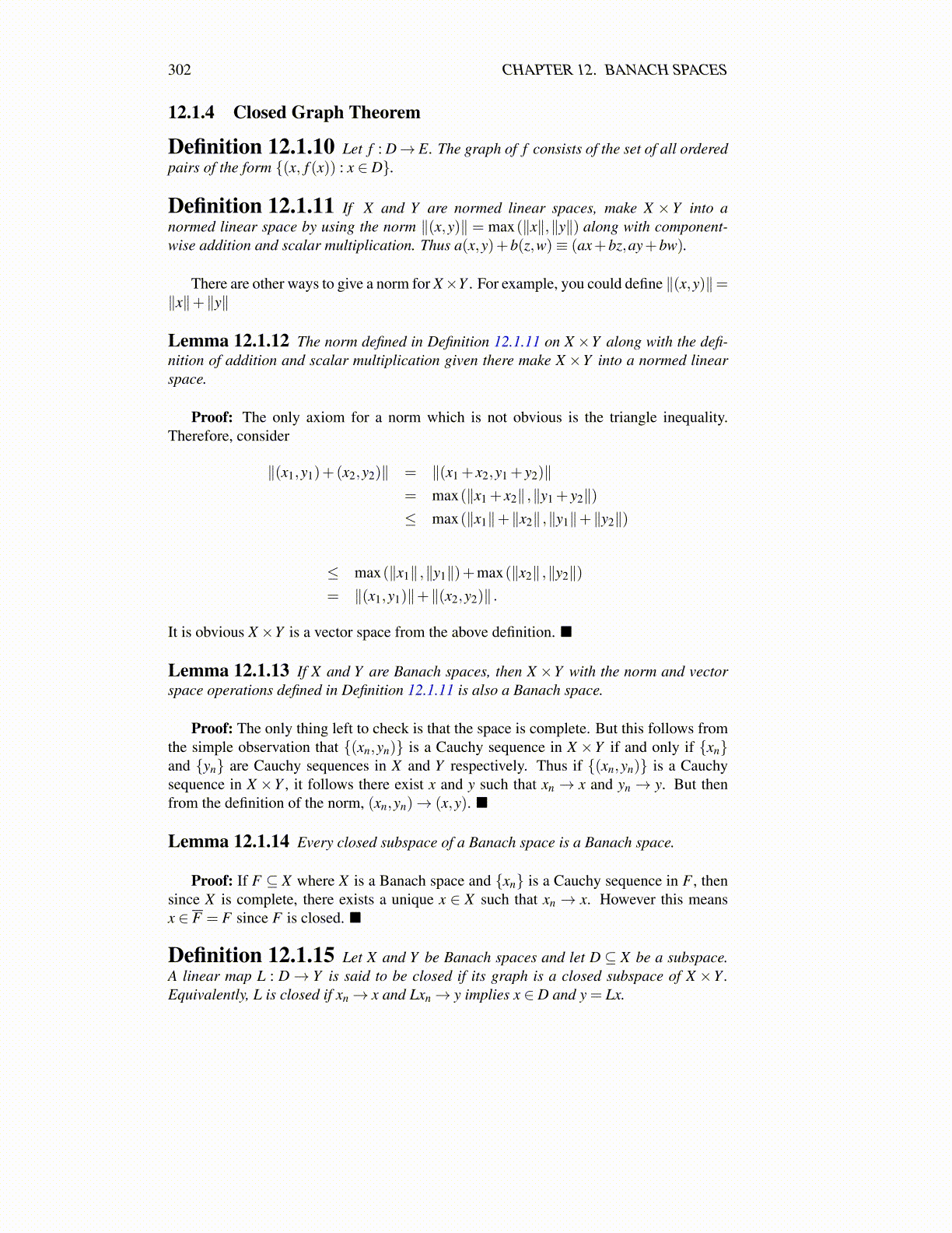 Definition 12.1.15 Let X and Y be Banach spaces and let D ⊆ X be a subspace.A linear map L : D→ Y is said to be closed if its graph is a closed subspace of X ×Y .Equivalently, L is closed if xn→ x and Lxn→ y implies x ∈ D and y = Lx.