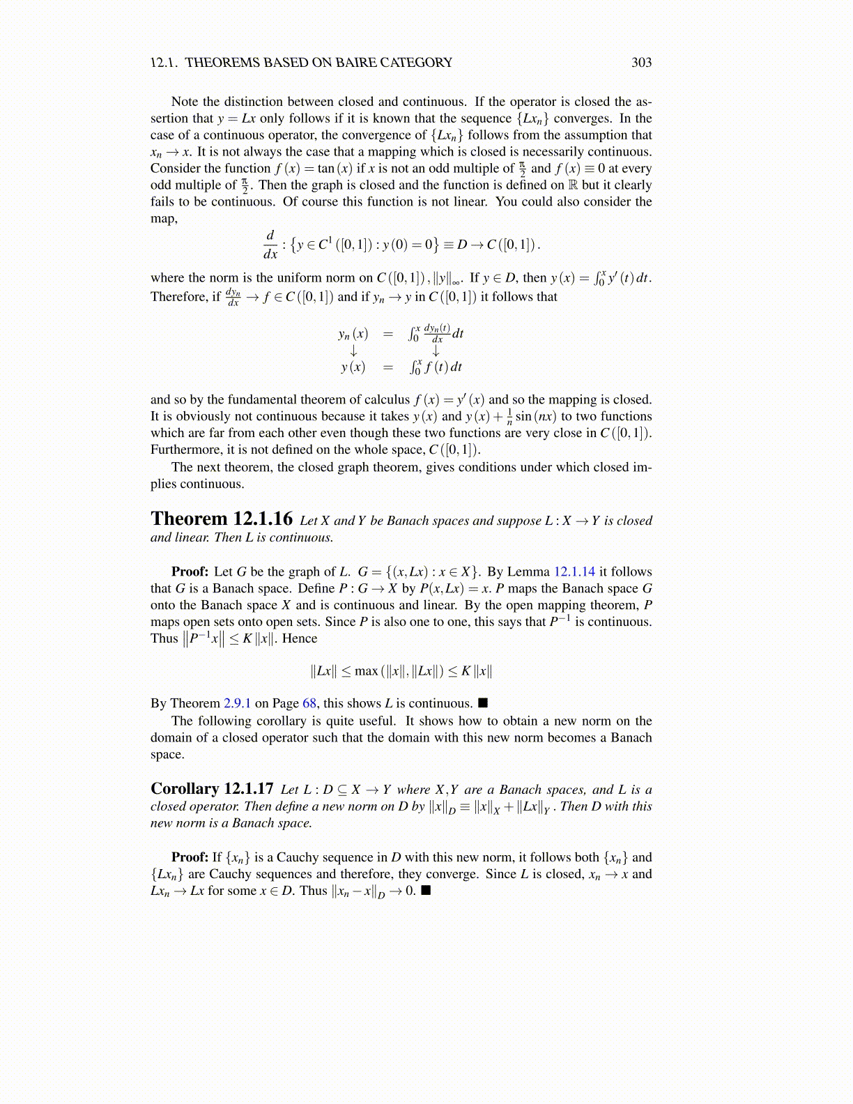 Corollary 12.1.17 Let L : D ⊆ X → Y where X ,Y are a Banach spaces, and L is aclosed operator. Then define a new norm on D by ∥x∥D ≡ ∥x∥X +∥Lx∥Y . Then D with thisnew norm is a Banach space.