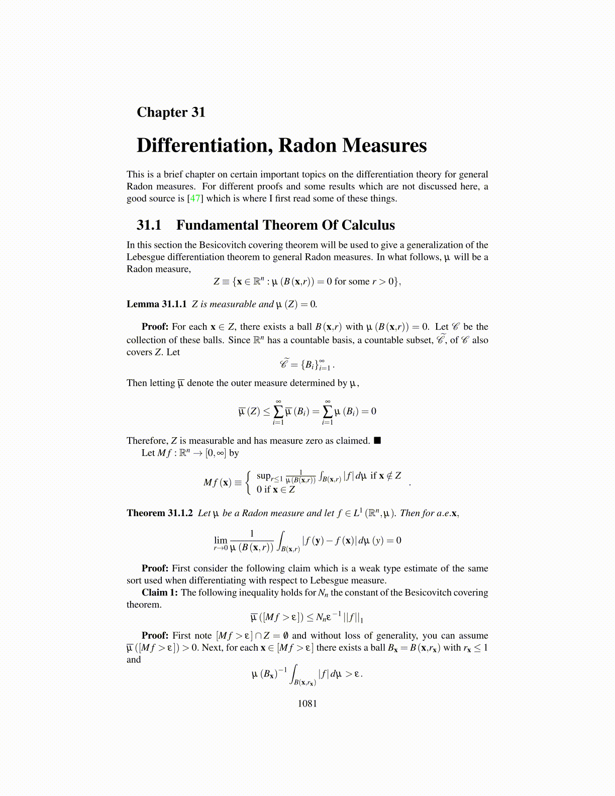 31.1 Fundamental Theorem Of CalculusIn this section the Besicovitch covering theorem will be used to give a generalization of theLebesgue differentiation theorem to general Radon measures. In what follows, µ will be aRadon measure,