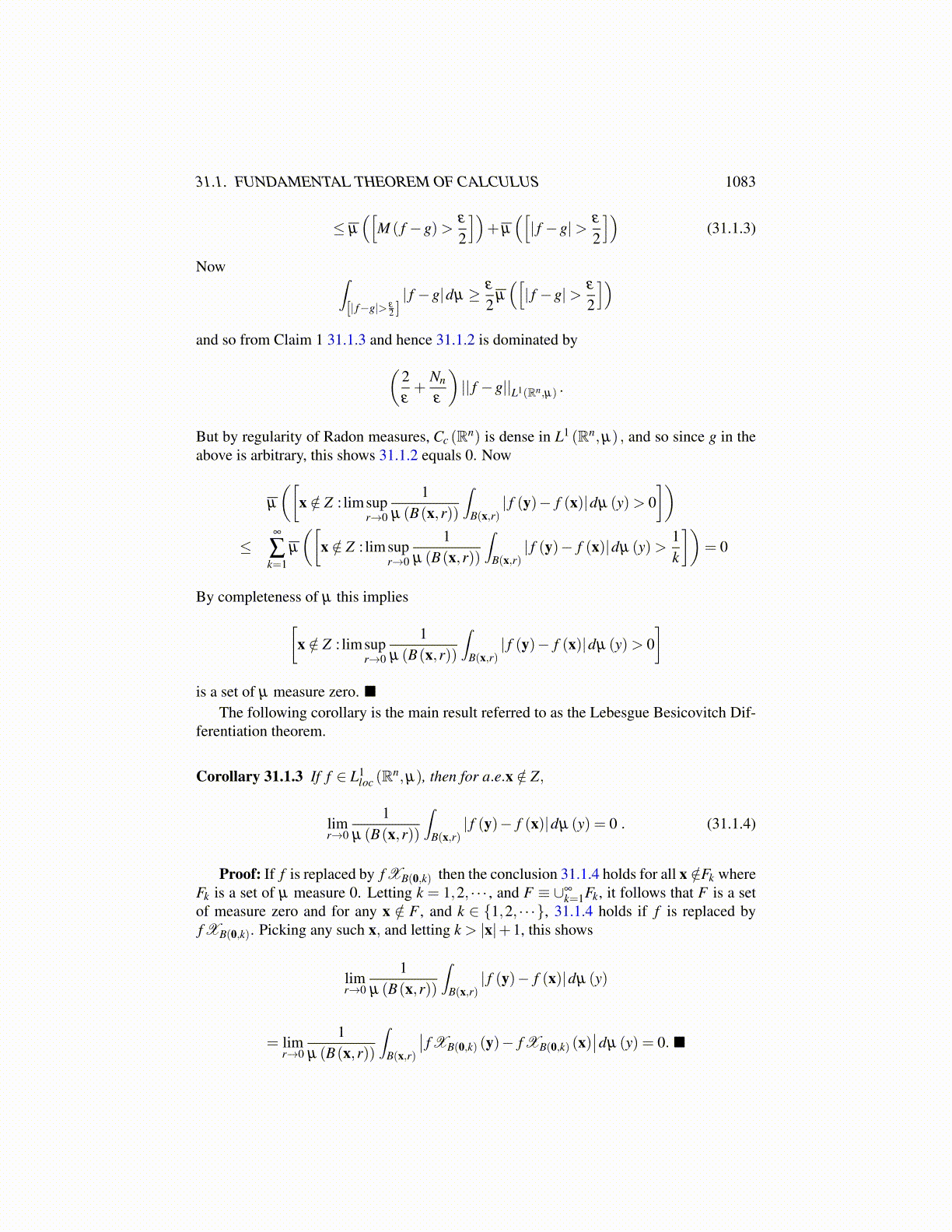 Proof: If f is replaced by f XB(0,k) then the conclusion 31.1.4 holds for all x /∈Fk whereFk is a set of µ measure 0. Letting k = 1,2, · · · , and F ≡ ∪∞