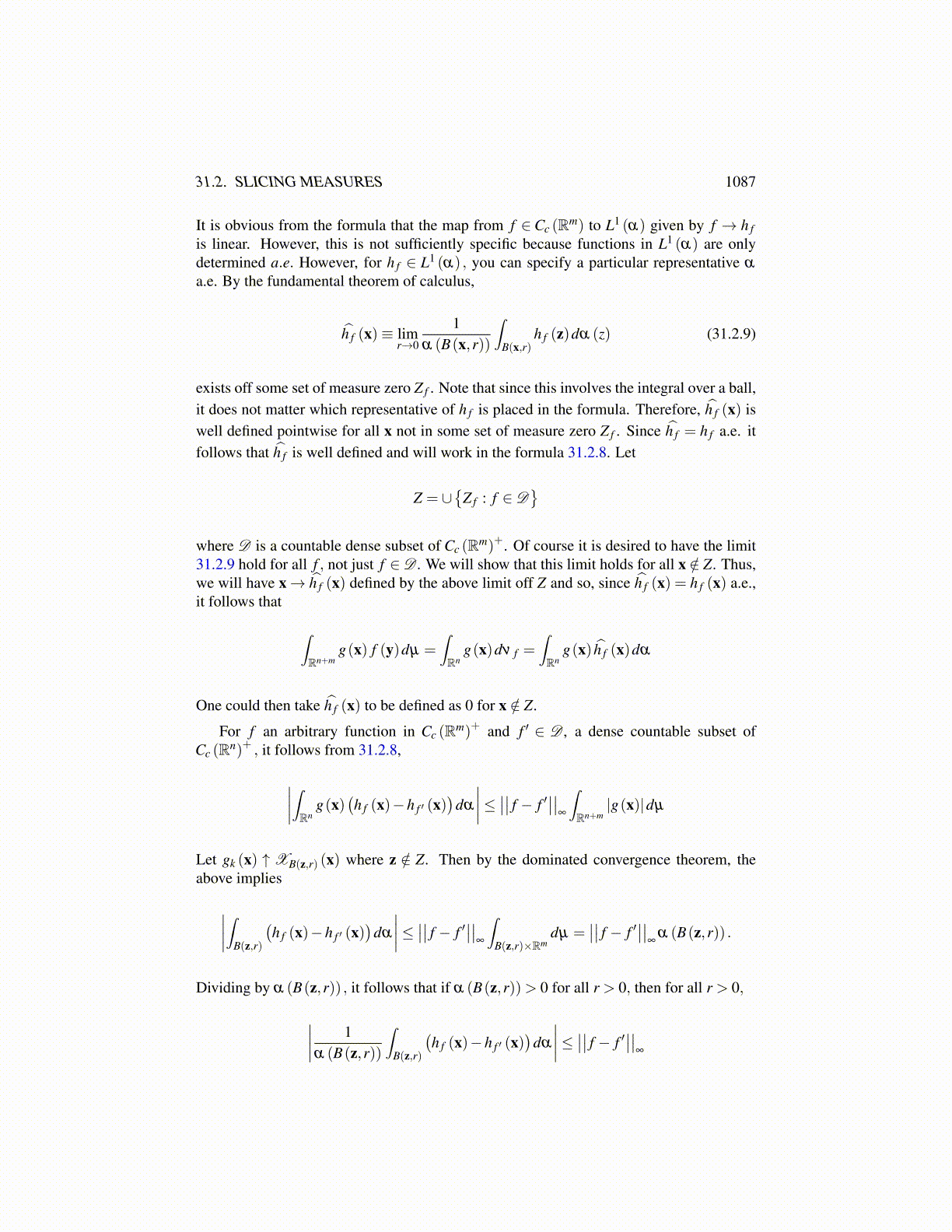 where D is a countable dense subset of Cc (Rm)+. Of course it is desired to have the limit31.2.9 hold for all f , not just f ∈D . We will show that this limit holds for all x /∈ Z. Thus,we will have x→ ĥ f (x) defined by the above limit off Z and so, since ĥ f (x) = h f (x) a.e.,it follows that