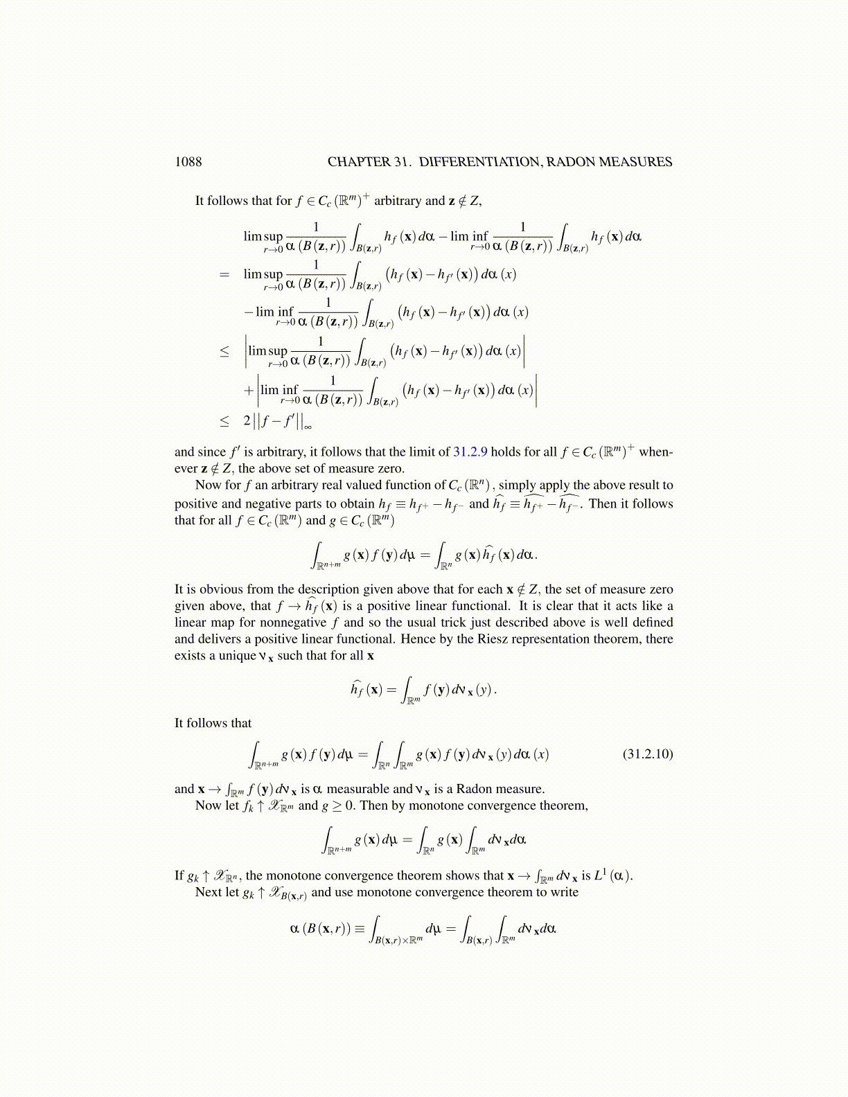 and since f ′ is arbitrary, it follows that the limit of 31.2.9 holds for all f ∈Cc (Rm)+ when-ever z /∈ Z, the above set of measure zero.