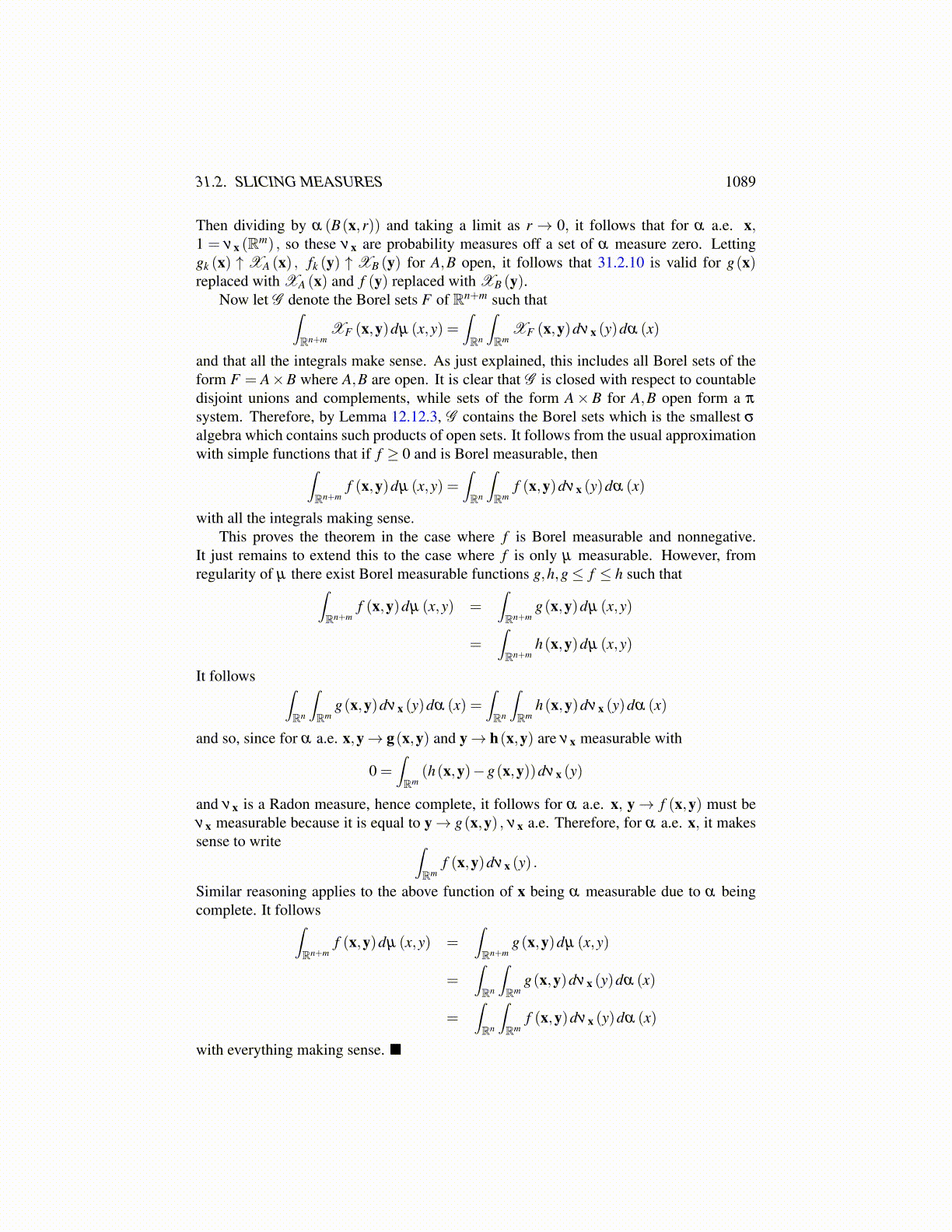 and νx is a Radon measure, hence complete, it follows for α a.e. x, y→ f (x,y) must beνx measurable because it is equal to y→ g(x,y) , νx a.e. Therefore, for α a.e. x, it makessense to write ∫