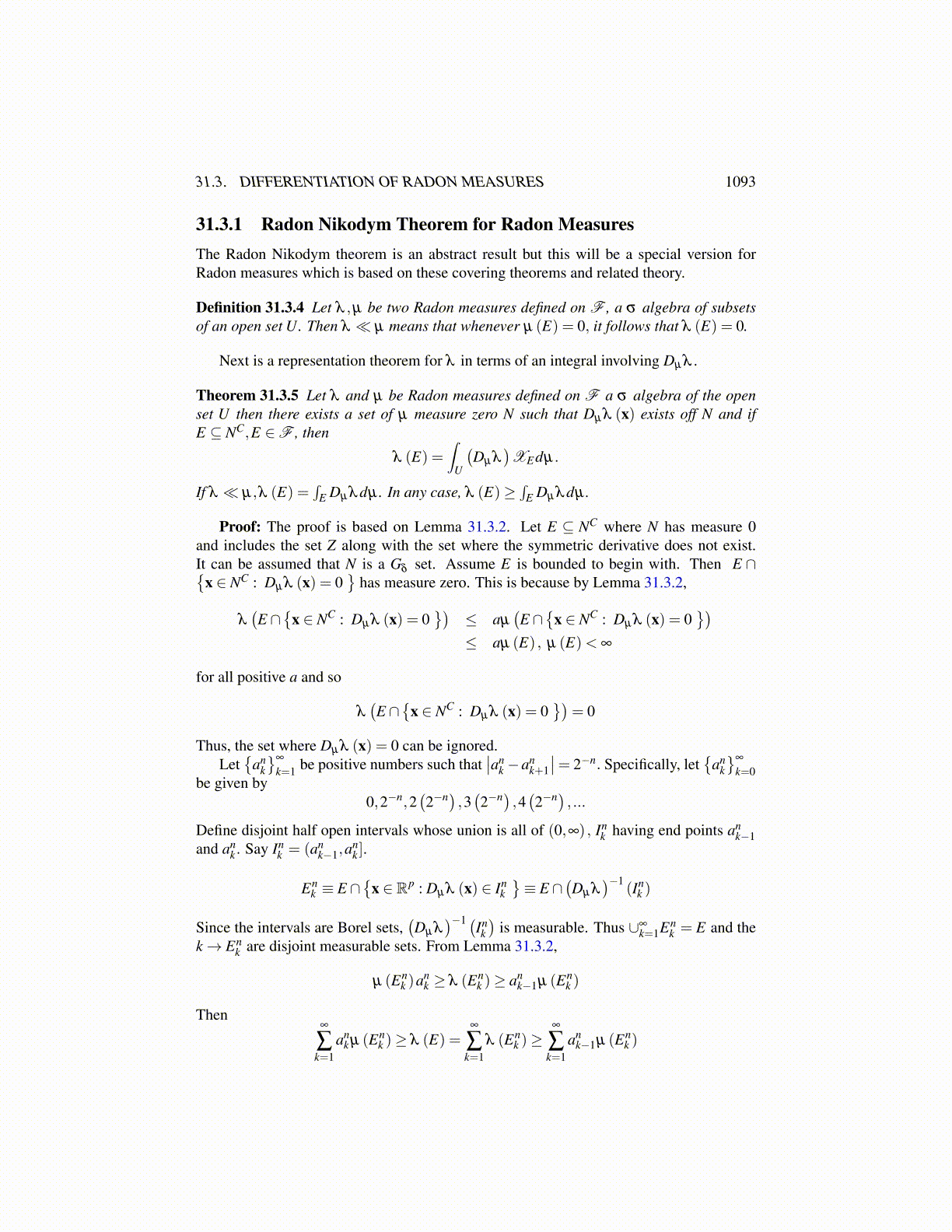 31.3.1 Radon Nikodym Theorem for Radon MeasuresThe Radon Nikodym theorem is an abstract result but this will be a special version forRadon measures which is based on these covering theorems and related theory.