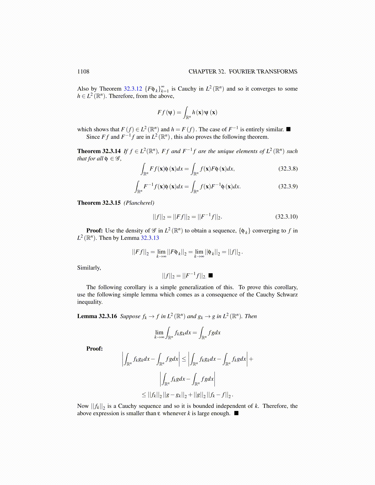 Theorem 32.3.14 If f ∈ L2(Rn), F f and F−1 f are the unique elements of L2 (Rn) suchthat for all φ ∈ G , ∫