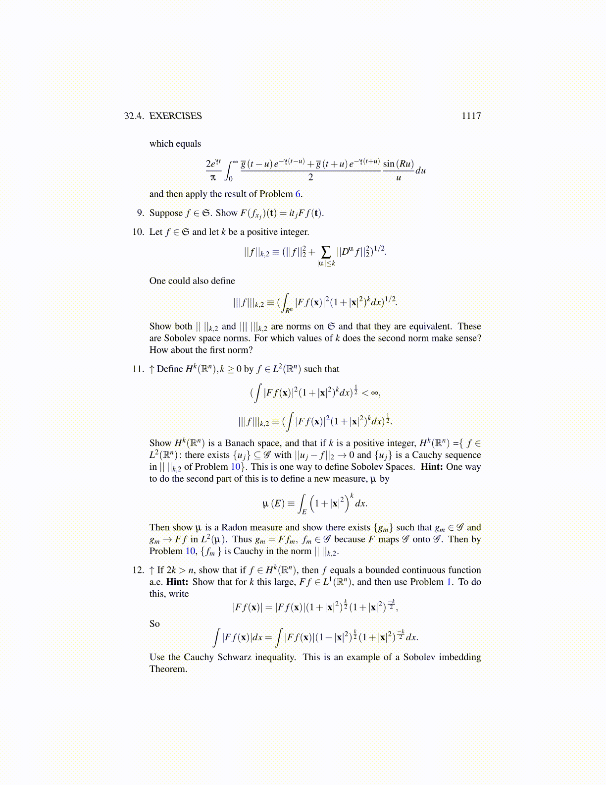 12. ↑ If 2k > n, show that if f ∈ Hk(Rn), then f equals a bounded continuous functiona.e. Hint: Show that for k this large, F f ∈ L1(Rn), and then use Problem 1. To dothis, write