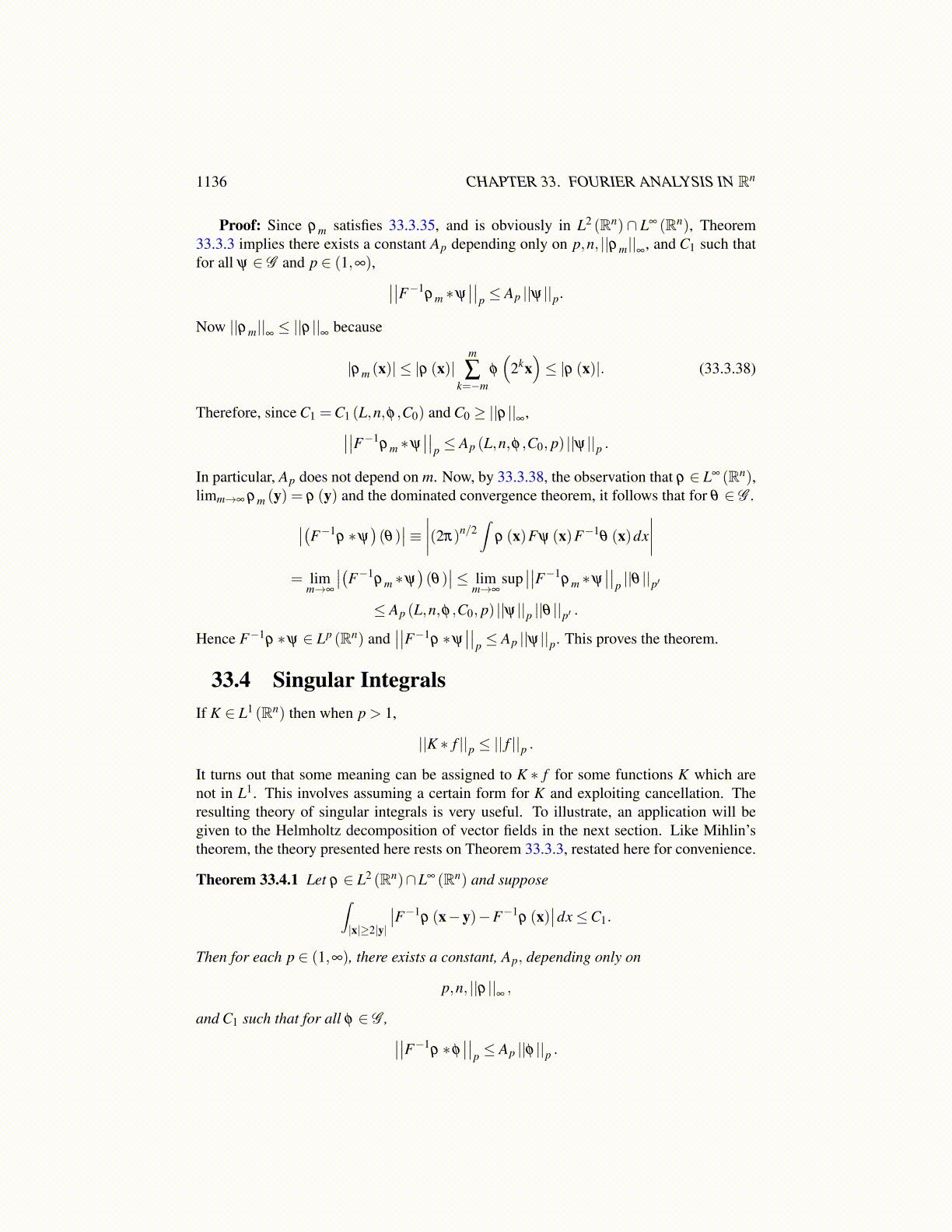 It turns out that some meaning can be assigned to K ∗ f for some functions K which arenot in L1. This involves assuming a certain form for K and exploiting cancellation. Theresulting theory of singular integrals is very useful. To illustrate, an application will begiven to the Helmholtz decomposition of vector fields in the next section. Like Mihlin’stheorem, the theory presented here rests on Theorem 33.3.3, restated here for convenience.