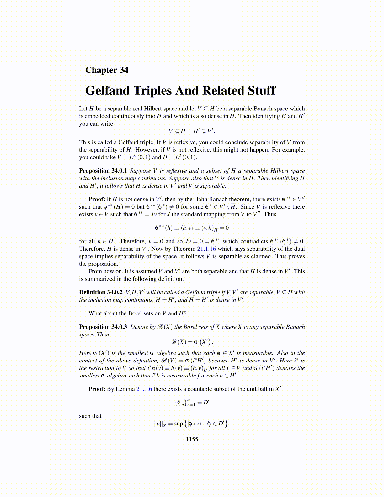 Definition 34.0.2 V,H,V ′ will be called a Gelfand triple if V,V ′ are separable, V ⊆H withthe inclusion map continuous, H = H ′, and H = H ′ is dense in V ′.
