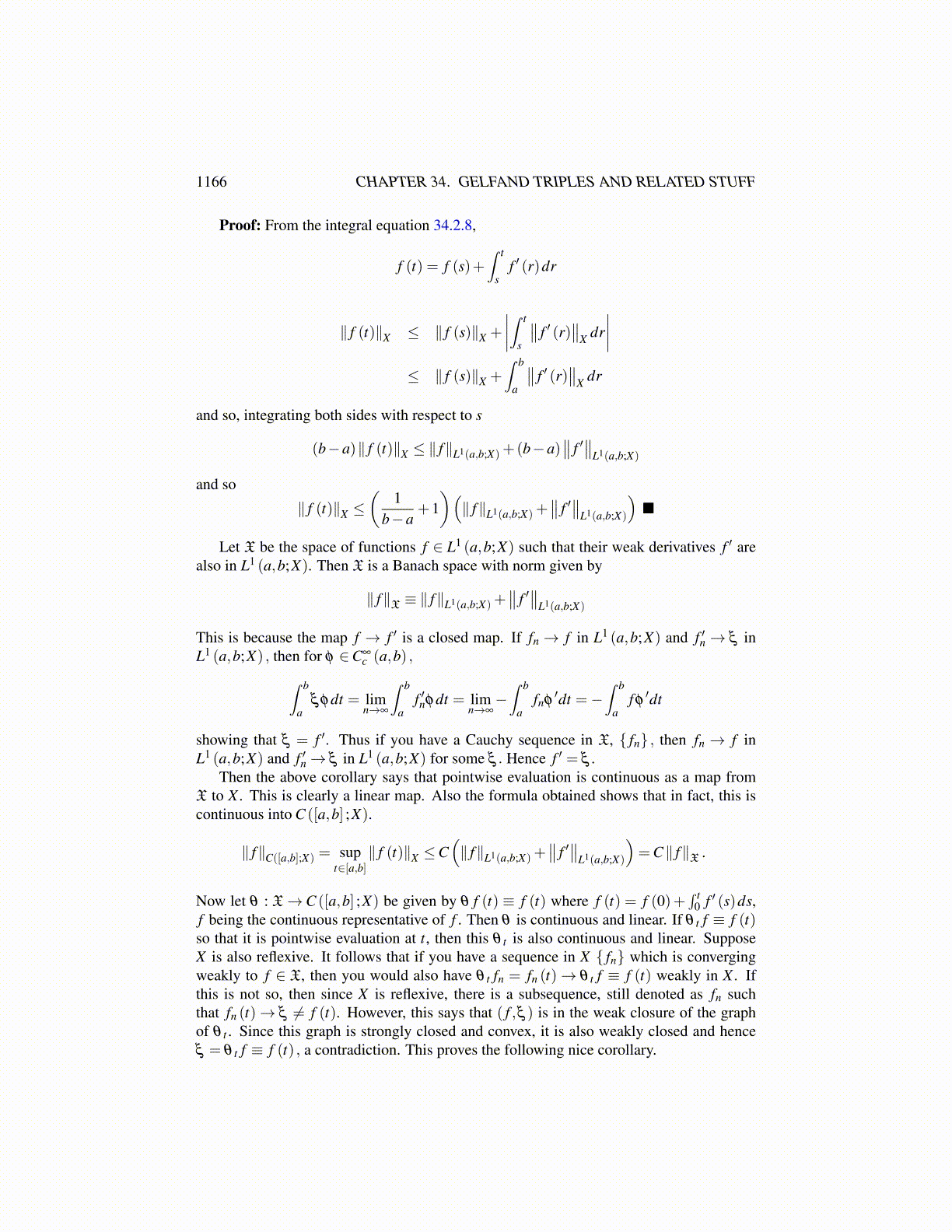 Then the above corollary says that pointwise evaluation is continuous as a map fromX to X . This is clearly a linear map. Also the formula obtained shows that in fact, this iscontinuous into C ([a,b] ;X).