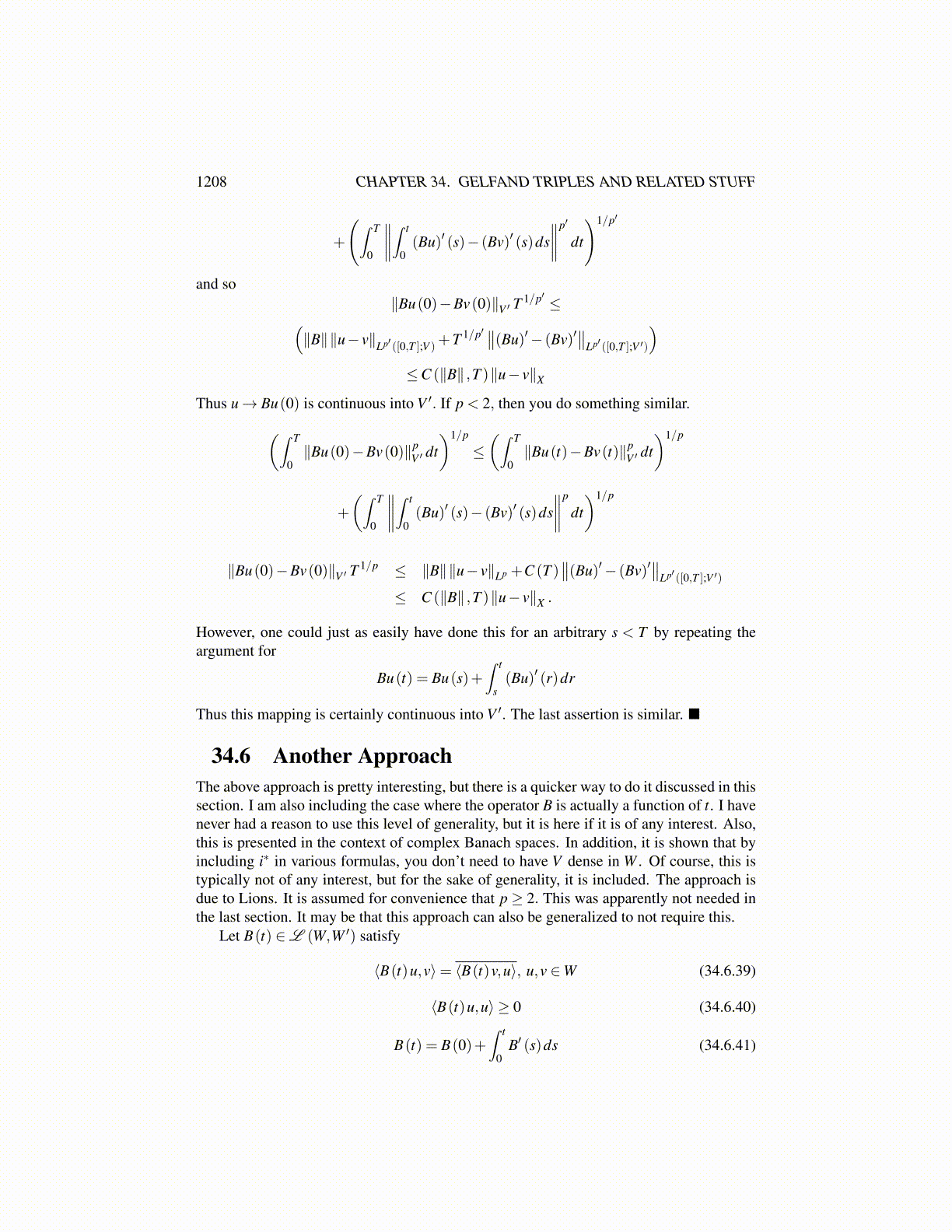 34.6 Another ApproachThe above approach is pretty interesting, but there is a quicker way to do it discussed in thissection. I am also including the case where the operator B is actually a function of t. I havenever had a reason to use this level of generality, but it is here if it is of any interest. Also,this is presented in the context of complex Banach spaces. In addition, it is shown that byincluding i∗ in various formulas, you don’t need to have V dense in W . Of course, this istypically not of any interest, but for the sake of generality, it is included. The approach isdue to Lions. It is assumed for convenience that p≥ 2. This was apparently not needed inthe last section. It may be that this approach can also be generalized to not require this.