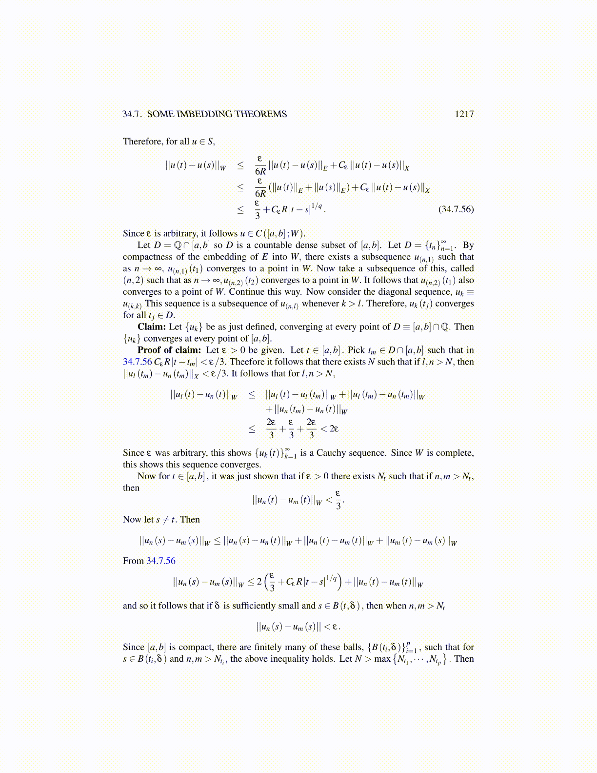 Proof of claim: Let ε > 0 be given. Let t ∈ [a,b] . Pick tm ∈ D∩ [a,b] such that in34.7.56 Cε R |t− tm|< ε/3. Theefore it follows that there exists N such that if l,n > N, then||ul (tm)−un (tm)||X < ε/3. It follows that for l,n > N,