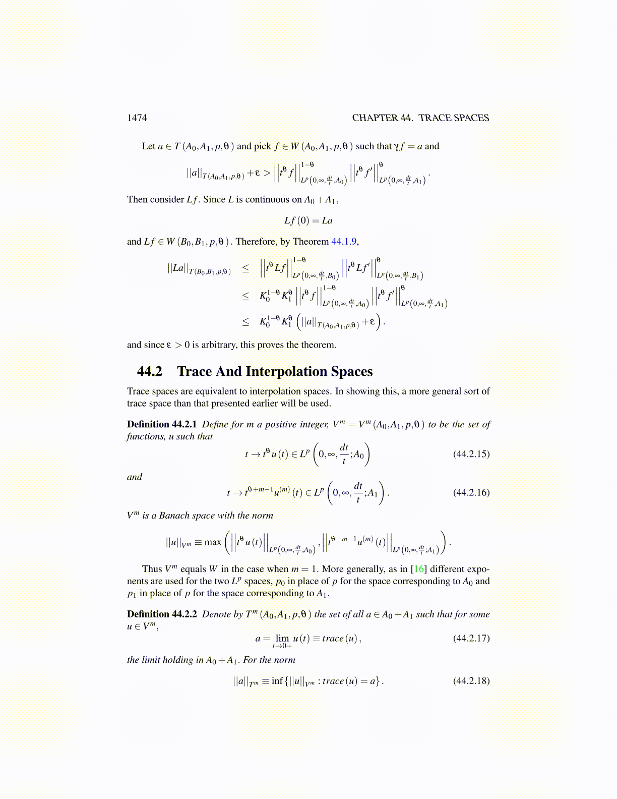 It remains to verify 44.1.7. To do this, let ψ ∈C∞ ([0,∞)) , with ψ (0) = 1 and ψ (t) = 0for all t > 1. Then consider the special f ∈W which is given by f (t) ≡ aψ (t) wherea ∈ A0 ∩A1. Thus f ∈W and f (0) = a so a ∈ T (A0,A1, p,θ) . From the first part, thereexists a constant, K such that