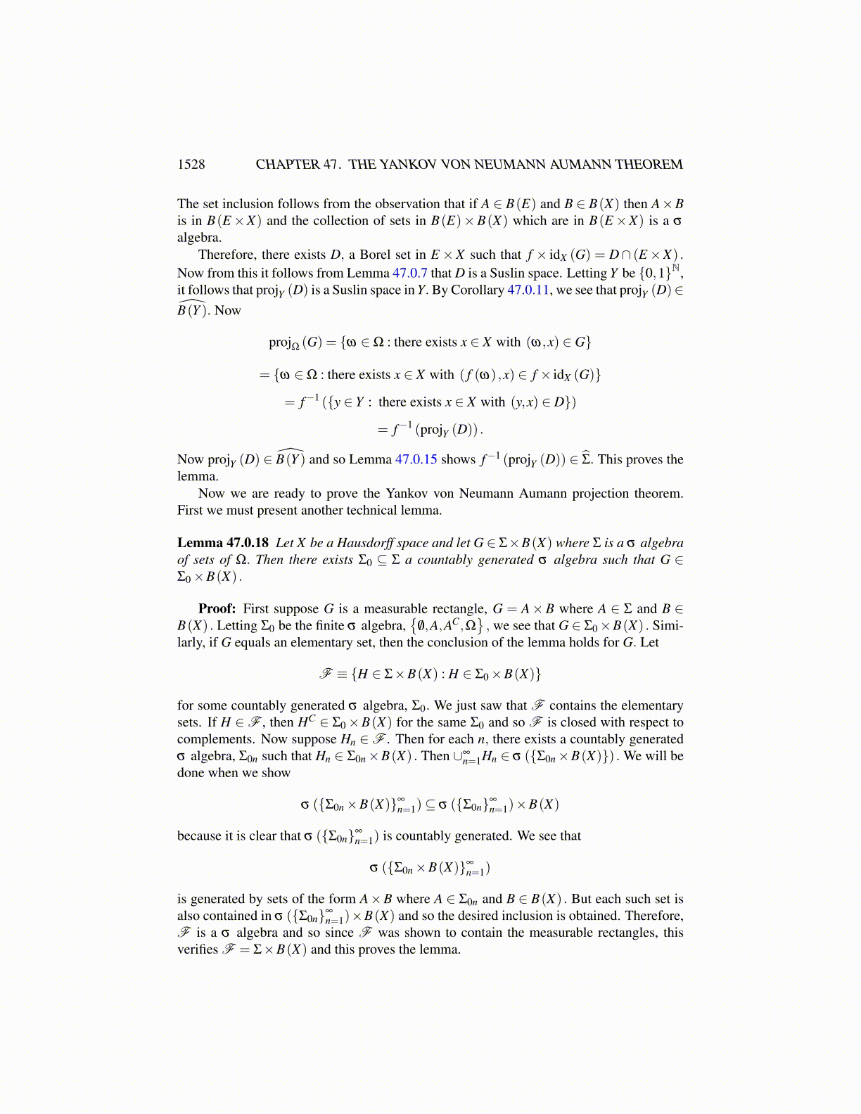 Lemma 47.0.14 Let (Ω,Σ) be separable. Then there exists E ∈ {0,1}N such that (Ω,Σ)and (E,B(E)) are isomorphic.