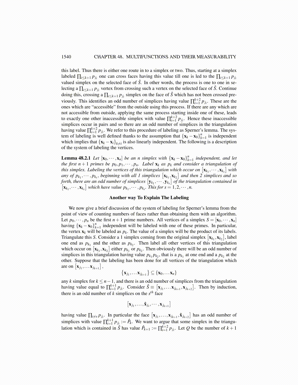 48.2 Existence of Measurable Fixed Points48.2.1 Simplices And LabelingFirst define an n simplex, denoted by [x0, · · · ,xn], to be the convex hull of the n+1 points,{x0, · · · ,xn} where {xi−x0}n