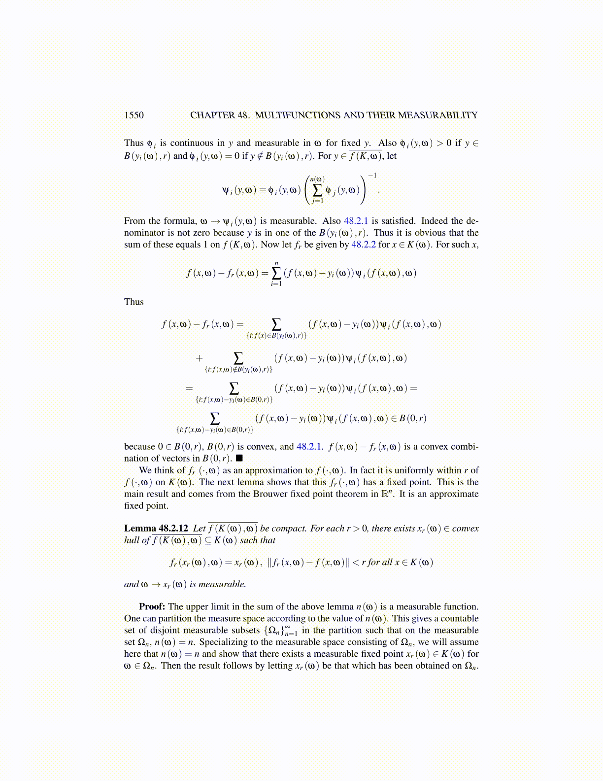 Theorem 48.2.8 Let K be a closed convex bounded subset of Rn. Let f(·,ω) : K→ K becontinuous for each ω and ω → f(x,ω) is measurable, meaning inverse images of setsopen in K are in F where (Ω,F ) is a measurable space. Then there exists x(ω) ∈ K suchthat ω → x(ω) is measurable and f(x(ω) ,ω) = x(ω).