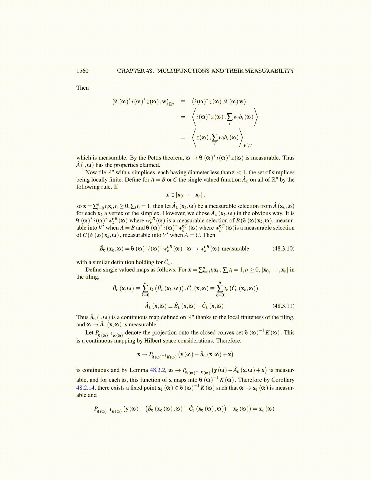 Theorem 48.3.3 Assumtions: Let B(·,ω) : V →P (V ′) ,C (·,ω) : V →P (V ′) for V aseparable Banach space. Suppose that ω → B(x,ω) ,ω → C (x,ω) each has a measur-able selection and x→ B(x,ω) ,x→ C (x,ω) each is upper semicontinuous from strongto weak topologies. Also let E (ω) be an n dimensional subspace of V which has a basis{b1 (ω) , · · · ,bn (ω)} each of which is a measurable function into V, and that K (ω)⊆E (ω)where K (ω) is a measurable multifunction which has convex closed bounded values. Alsolet y(ω) be given, a measurable function into V ′. Conclusion: There exist measurable func-tions wB (ω) ,wC (ω) and x(ω) with wB (ω) ∈ B(x(ω) ,ω) ,wC (ω) ∈ C (x(ω) ,ω) , andx(ω) ∈ K (ω) such that for all z ∈ K (ω) ,