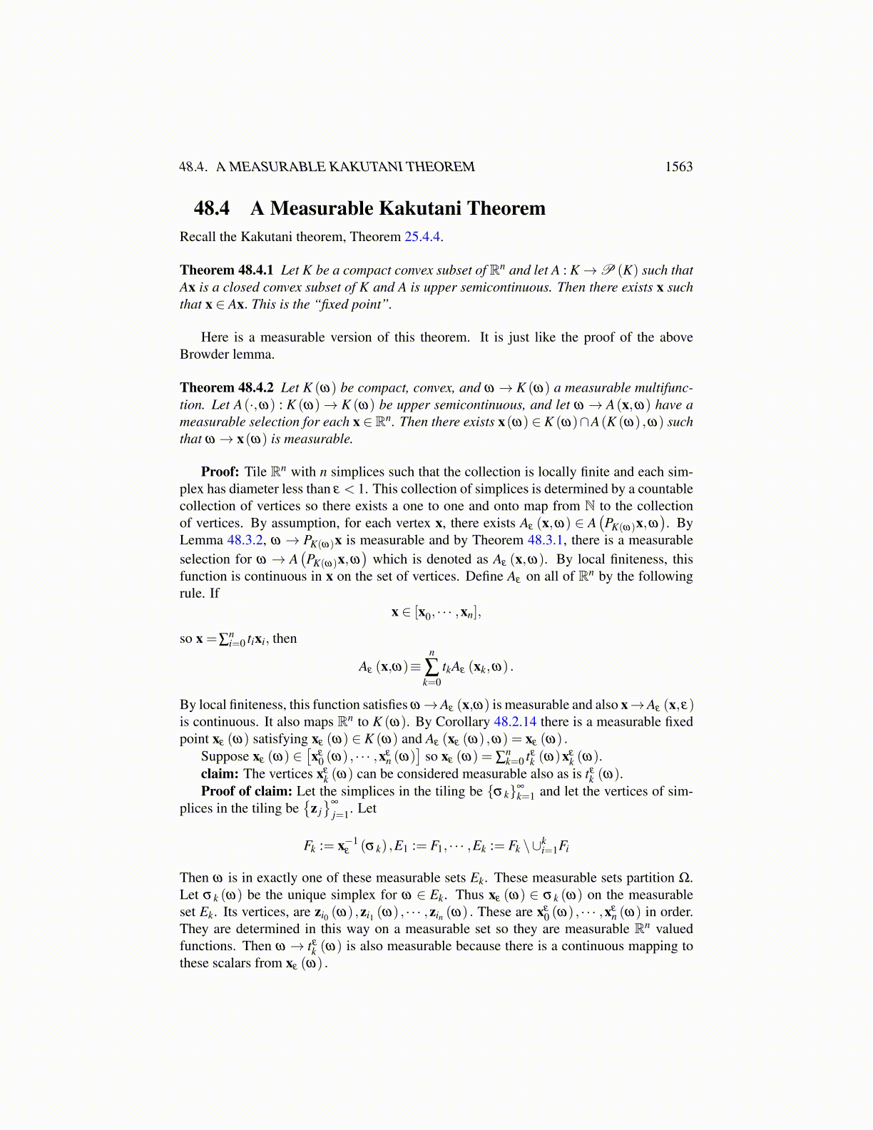 Then each ω is in exactly one of these measurable sets Ek which partition Ω. For ω ∈Ek,xε (ω) ∈ σ k (ω). Thus σ k (ω) is the first simplex which contains xε (ω) and the or-dered vertices of this simplex are constant on the measurable set Ek. These vertices aredetermined this way on a measurable set Ek and so they must be measurable Rn valuedfunctions. Then ω → tε