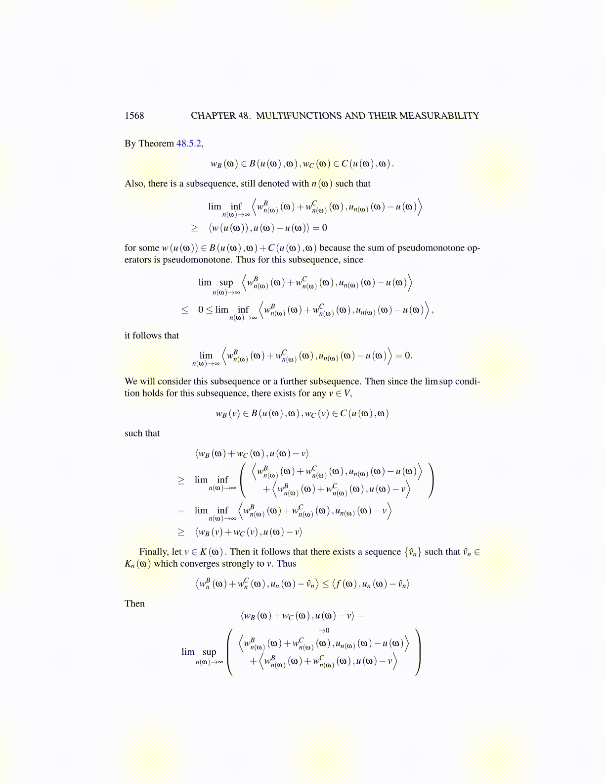 Theorem 48.5.3 Let V be a reflexive separable Banach space. Let ω → K (ω) be a mea-surable multifunction, K (ω) convex, closed, and bounded. Also for A = B,C let A(·, ·)satisfy 1 - 3. Let ω→ f (ω) be measurable with values in V ′. Then there exists measurableω → u(ω) ∈ K (ω) and ω → wB (ω) , ω → wC (ω) with wB (ω) ∈ B(u(ω) ,ω) ,wC (ω) ∈C (u(ω) ,ω) such that