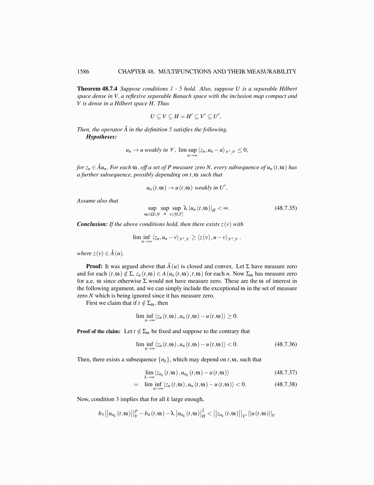 These wn (t) are bounded for each t off a set of measure zero and so by Lemma 48.7.1, thereis a measurable function t→ z(t) and a subsequence wn(t) (t)→ z(t) weakly as n(t)→ ∞.Now A(u(t) , t) is closed and convex, hence weakly closed as well. Thus z(t) ∈ A(u(t) , t)and