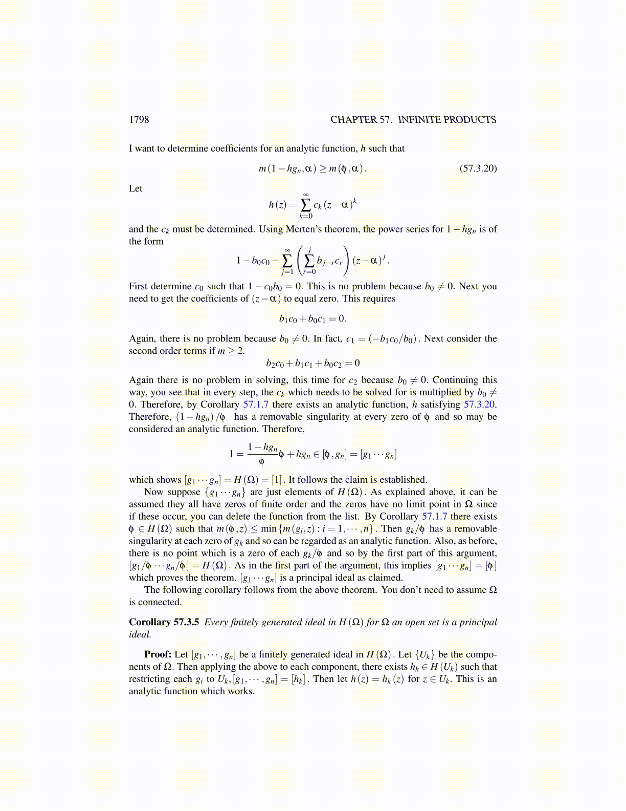 Definition 57.3.3 Denote by H (Ω) the analytic functions defined on Ω, an open subsetof C. Then H (Ω) is a commutative ring2 with the usual operations of addition and mul-tiplication. A set, I ⊆ H (Ω) is called a finitely generated ideal of the ring if I is of theform {