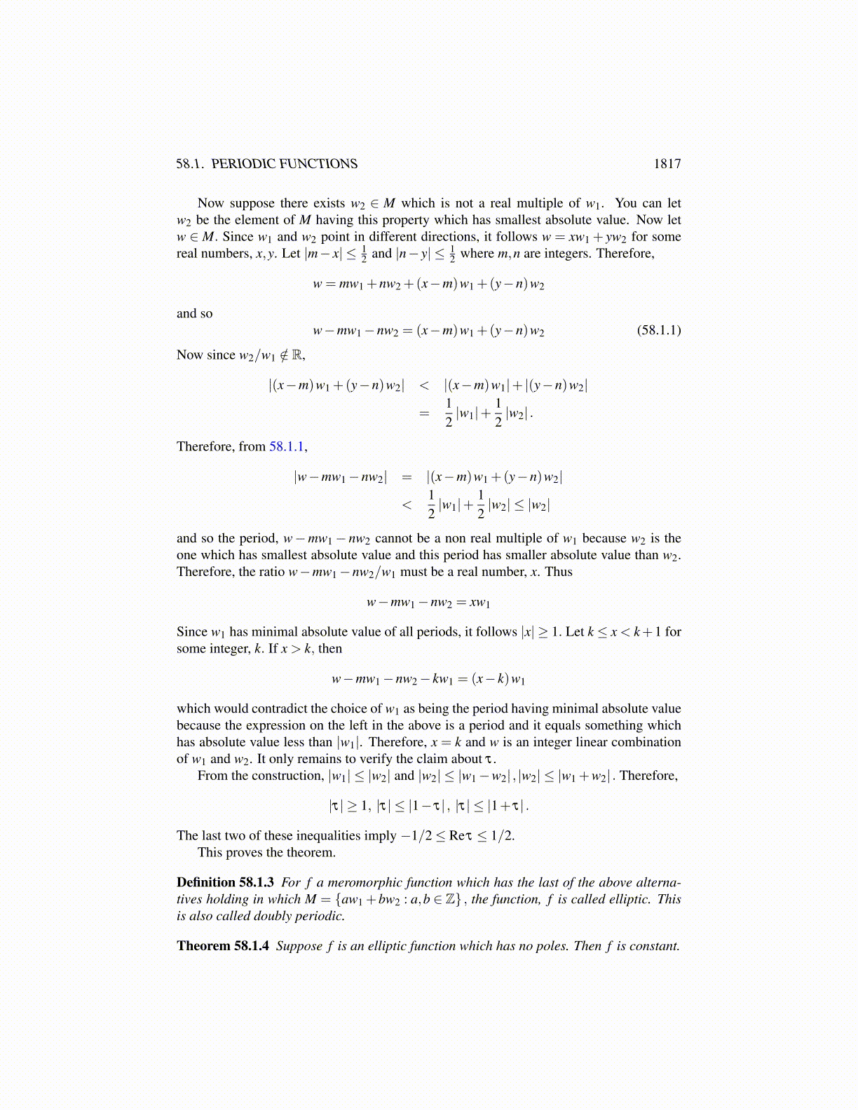 Elliptic FunctionsThis chapter is to give a short introduction to elliptic functions. There is much more avail-able. There are books written on elliptic functions. What I am presenting here followsAlfors [3] although the material is found in many books on complex analysis. Hille, [65]has a much more extensive treatment than what I will attempt here. There are also manyreferences and historical notes available in the book by Hille. Another good source formore having much the same emphasis as what is presented here is in the book by Saks andZygmund [115]. This is a very interesting subject because it has considerable overlap withalgebra.