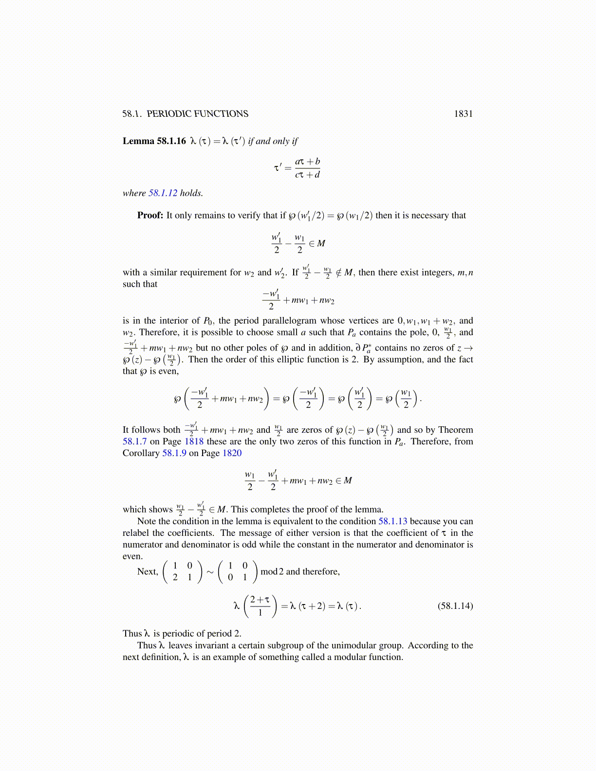 consider (w1 +w2)/2 and choose Pa such that its boundary contains no zeros of the ellipticfunction, z→℘(z)−℘((w1 +w2)/2) and Pa contains no poles of ℘ on its interior otherthan 0. Then if ℘(w2/2) =℘((w1 +w2)/2) , it follows from Theorem 58.1.7 on Page1820 w2/2 and (w1 +w2)/2 are the only two zeros of ℘(z)−℘((w1 +w2)/2) on Pa andby Corollary 58.1.9 on Page 1822