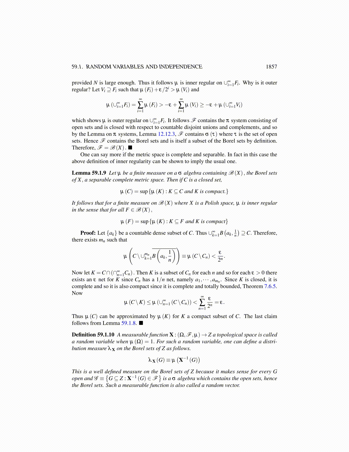 Proposition 59.1.6 If X : Ω→ Z is measurable, then σ (X) equals the smallest σ algebrasuch that X is measurable with respect to it. Also if Xi are random variables having valuesin separable Banach spaces Zi, then σ (X) = σ (X1, · · · ,Xn) where X is the vector mappingΩ to ∏