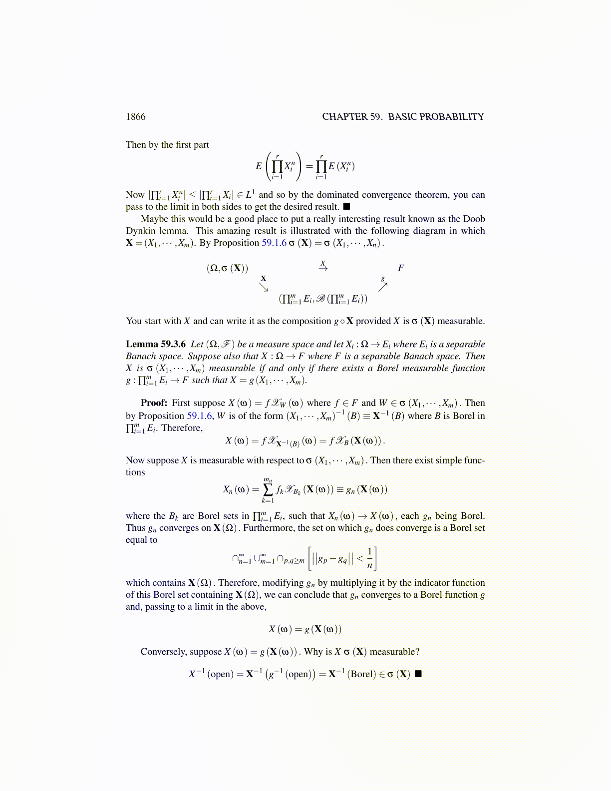 Lemma 59.3.4 Suppose the set of random variables, {Xi}i∈I is independent. Also supposeI1 ⊆ I and j /∈ I1. Then the σ algebras σ (Xi : i ∈ I1) , σ (X j) are independent σ algebras.