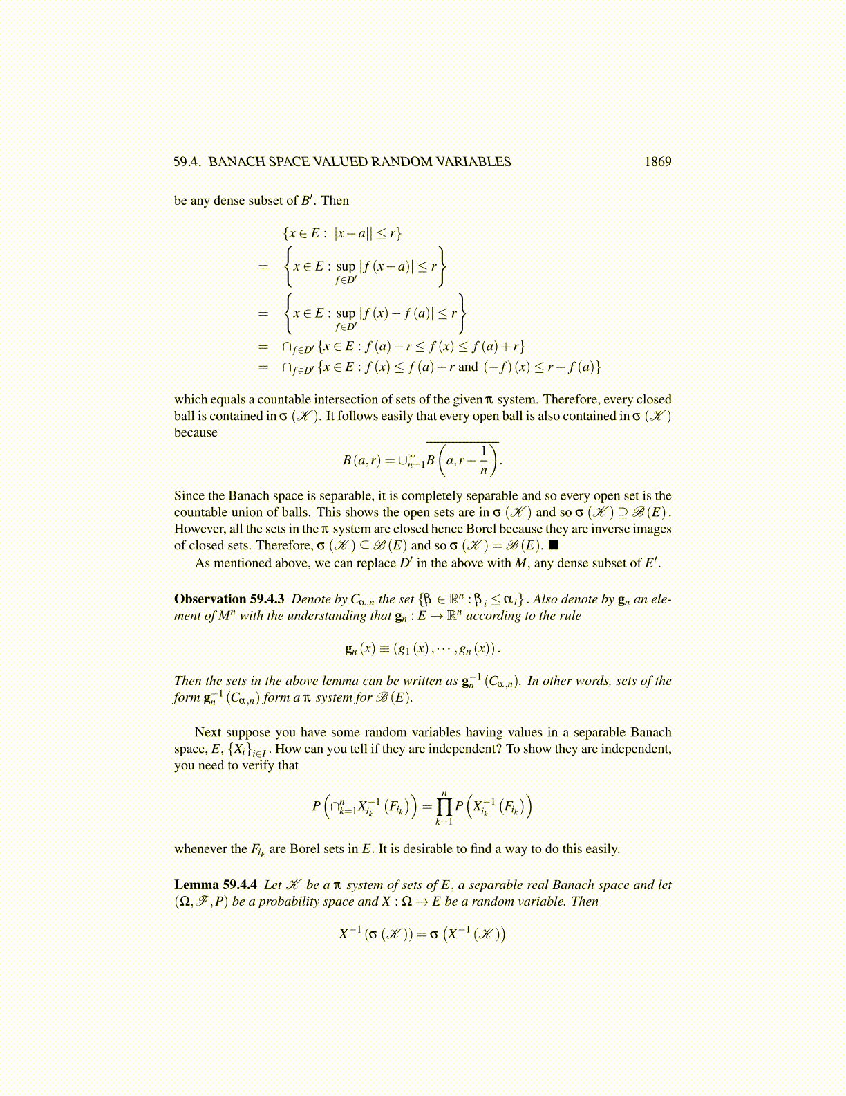 59.4 Banach Space Valued Random VariablesRecall that for X a random variable, σ (X) is the smallest σ algebra containing all the setsof the form X−1 (F) where F is Borel. Since such sets, X−1 (F) for F Borel form a σ