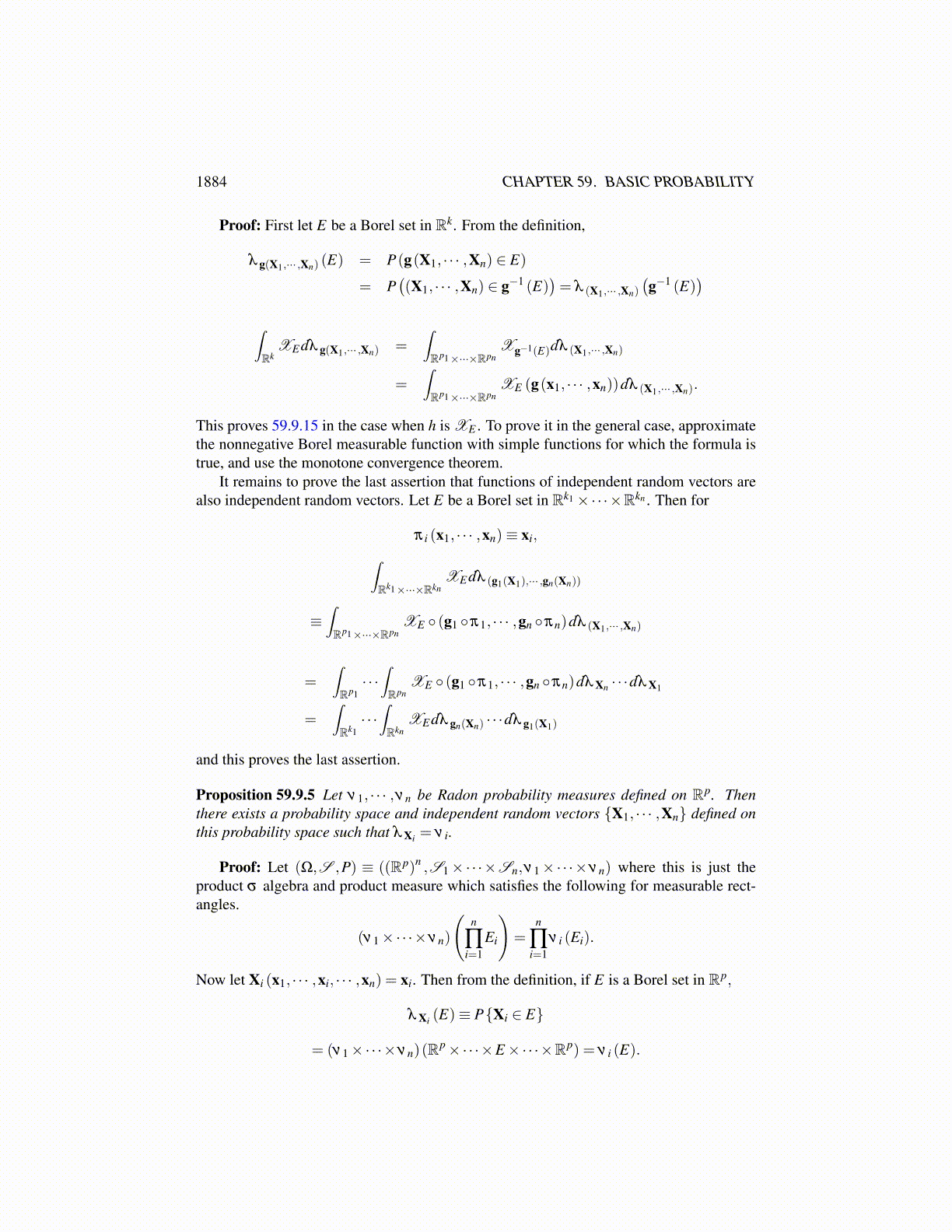 Definition 59.9.2 Let {X1, · · · ,Xn} be random vectors defined on a probability space hav-ing values in Rp1 , · · · ,Rpn respectively. The random vectors are independent if for every Ea Borel set in Rp1 ×·· ·×Rpn , ∫