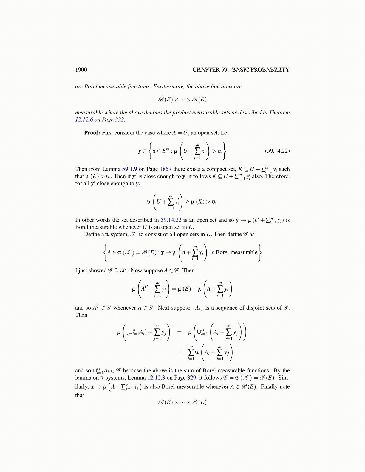 59.14 Convolution And SumsLemma 59.1.9 on Page 1859 makes possible a definition of convolution of two probabilitymeasures defined on B (E) where E is a separable Banach space as well as some otherinteresting theorems which held earlier in the context of locally compact spaces. I will firstshow a little theorem about density of continuous functions in Lp (E) and then define theconvolution of two finite measures. First here is a simple technical lemma.